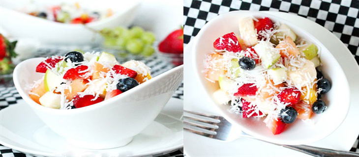 Múc salad trái cây ra đĩa và rắc lên phía trên dừa nạo trước khi thưởng thức.