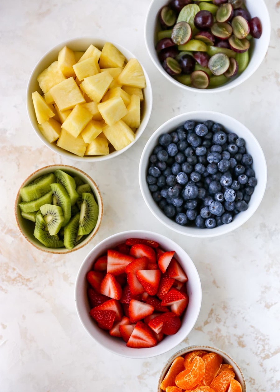 - Bạn tiến hành rửa sạch các loại trái cây đã chuẩn bị và dùng dao cắt thái như sau: Táo để nguyên vỏ, loại bỏ hạt và lõi giữa, cắt khúc vừa ăn. Dâu tây bỏ cuống, cắt làm 2 hoặc làm 4. Nho cắt làm đôi. Dưa lưới loại bỏ vỏ và cắt từng khúc vừa ăn.