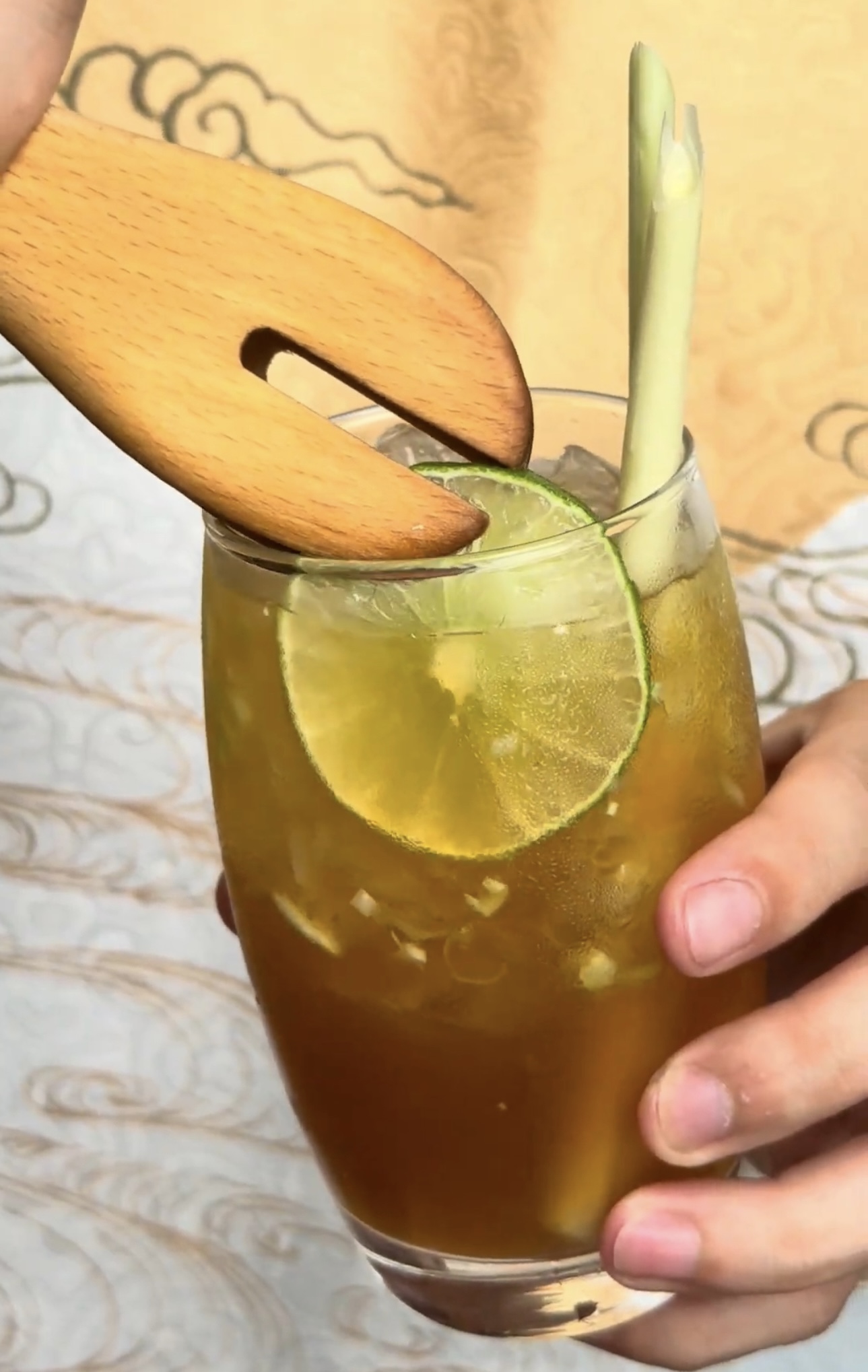 Thêm đá , thêm sả đã đập dập, và lát chanh để trang trí là đã xong rồi.