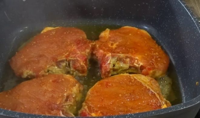 Lấy chảo chiên để già lửa cho nóng chảo, bỏ ít dầu, hạ lửa nhỏ, bỏ thịt cốt lết vào chiên