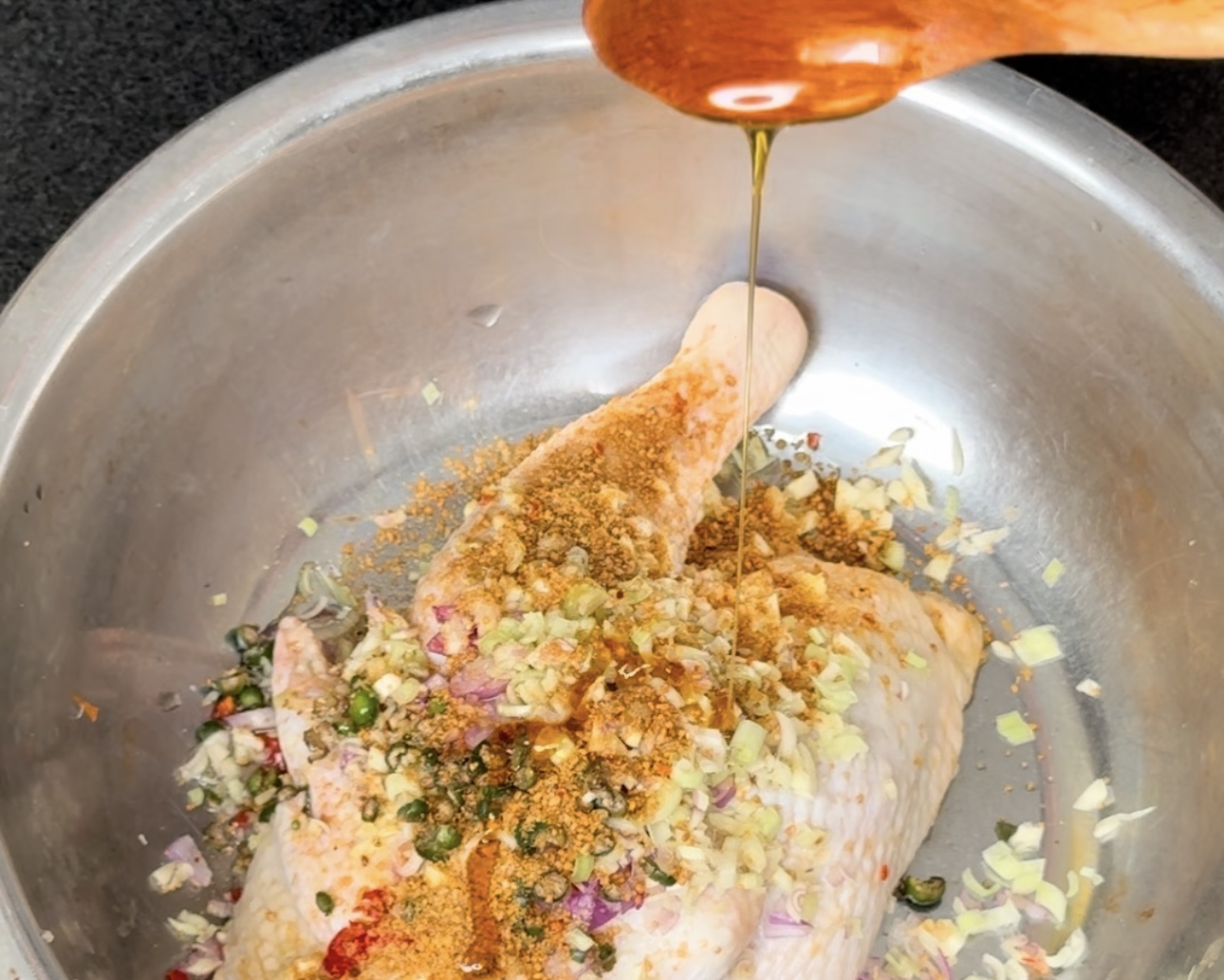 Hãy pha 2 muỗng canh mật ong với 2 muỗng canh dầu ăn để làm hỗn hợp phết lên da gà.