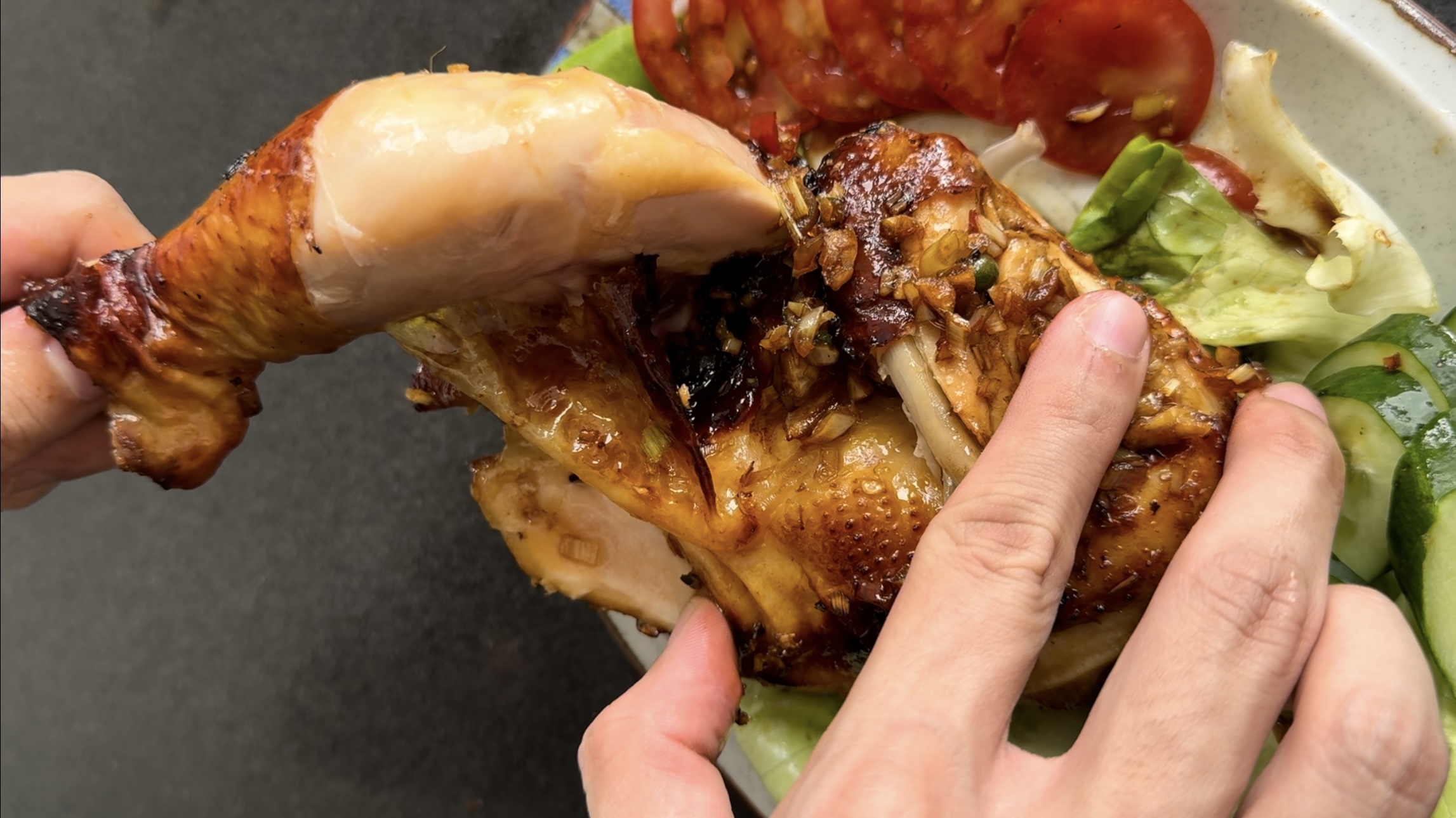 Nếu bạn thấy gà đã vàng đẹp thì có thể lấy xuống và thưởng thức rồi đấy. Thịt gà ướp màu vàng óng ánh của mật ong trong vô cùng bắt mắt. Từng miếng thịt gà mềm, thơm lại đậm đà gia vị, ăn kèm với rau sống, dưa leo và cà chua đảm bảo rất hao cơm luôn đấy.