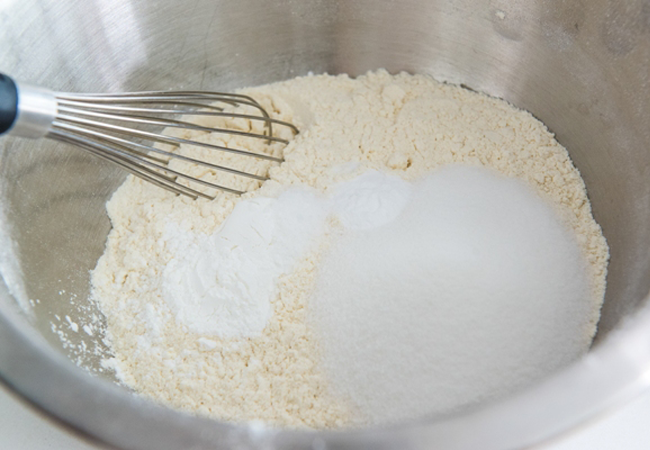 Bước 1: Chuẩn bị một chiếc tô lớn, rây tất cả các loại bột đã chuẩn bị như bột mì đa dụng, bột nở cùng với muối vào tô để loại bỏ cặn bột. Dùng phới lồng cầm tay trộn cho hỗn hợp hòa quyện. Trong trường hợp bạn chưa có kinh nghiệm trộn bột thì có thể mua luôn loại bột pancake nhé ( hãy tìm theo tiếng việt là bột bánh rán, sẽ thấy ngay trong các siêu thị đều có) , lấy gói bột bánh rán pancake, thêm trái trứng vào trộn đều là được, thêm 3 muỗng mật ong vào nhé.