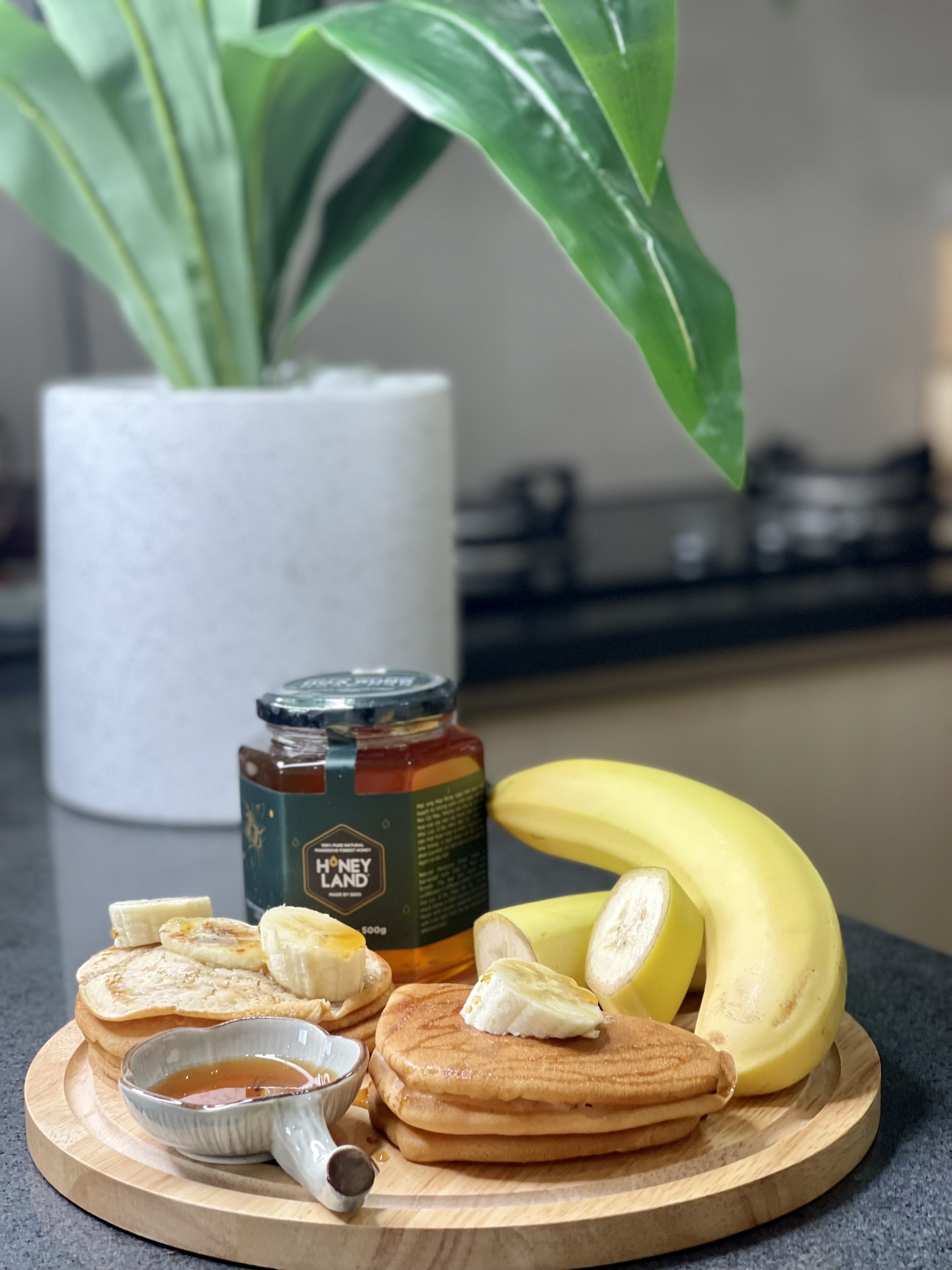 Khi thưởng thức, bạn chỉ cần xếp chồng 3 – 4 miếng bánh lên nhau, sau đó, cắt thêm một vài lát chuối trang trí lên đĩa, rưới thêm mật ong Honeyland để món ăn thêm hấp dẫn, thơm ngon và dinh dưỡng.
