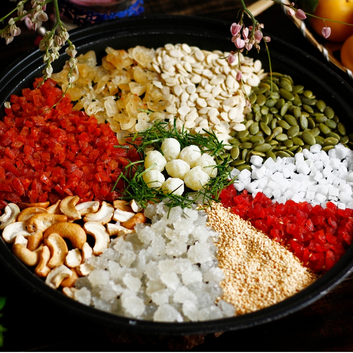 Tiếp theo, băm nhỏ mứt vỏ chanh và mứt gừng đỏ. Các loại hạt khác như bí xanh, hạt sen, hạt điều thì giã nhỏ.
