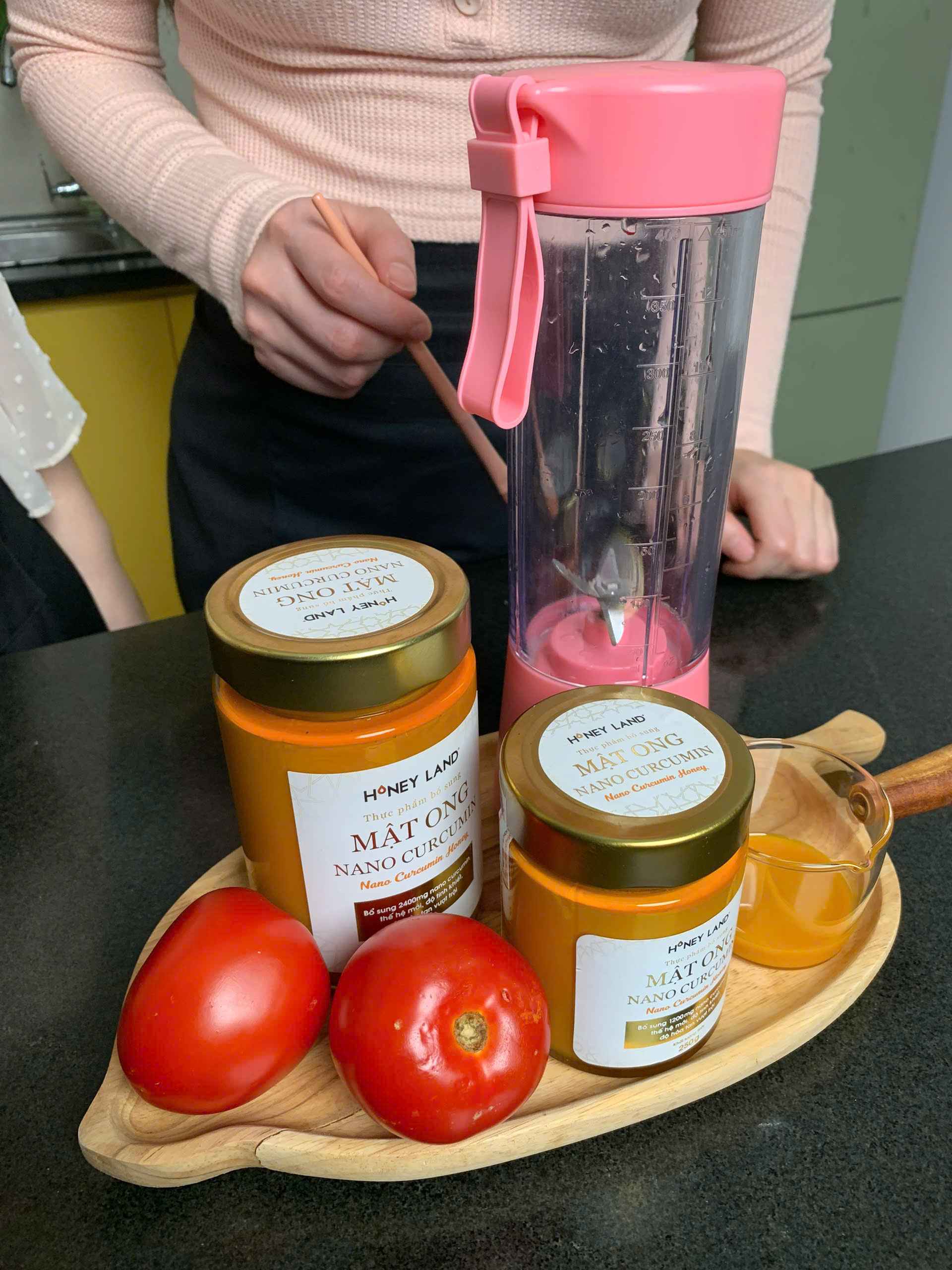 Cho phần cà chua đã xay vào bát nhỏ, thêm 1–2 muỗng cà phê mật ong nghệ nano curcumin rồi trộn đều. Hỗn hợp có màu vàng cam nhạt, mịn nhẹ và mùi thơm tự nhiên từ cà chua và mật ong.