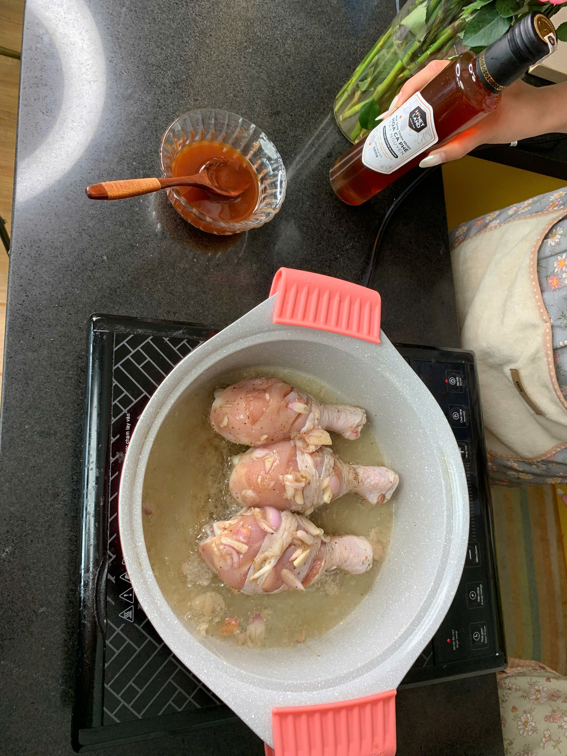 Rim lửa nhỏ khoảng 10–15 phút, trở đều các mặt đến khi sốt sệt lại, áo đều đùi gà, tạo màu vàng óng hấp dẫn.