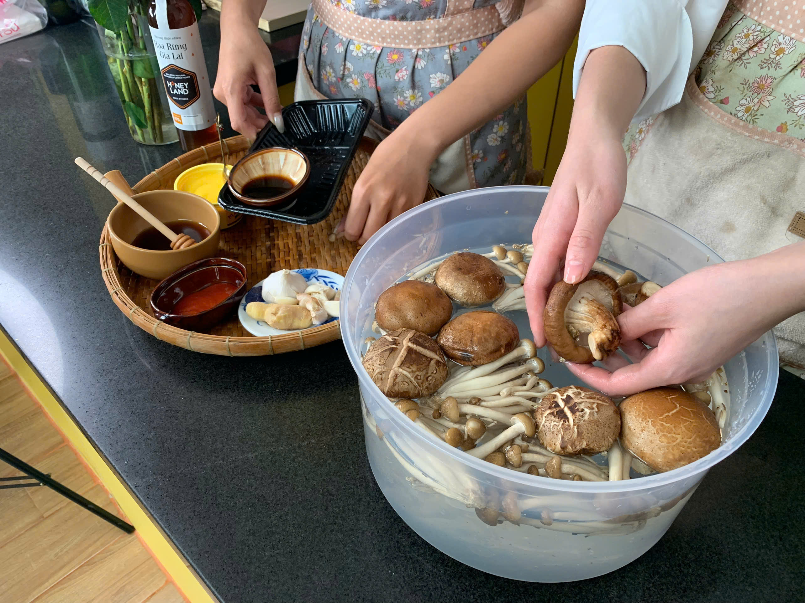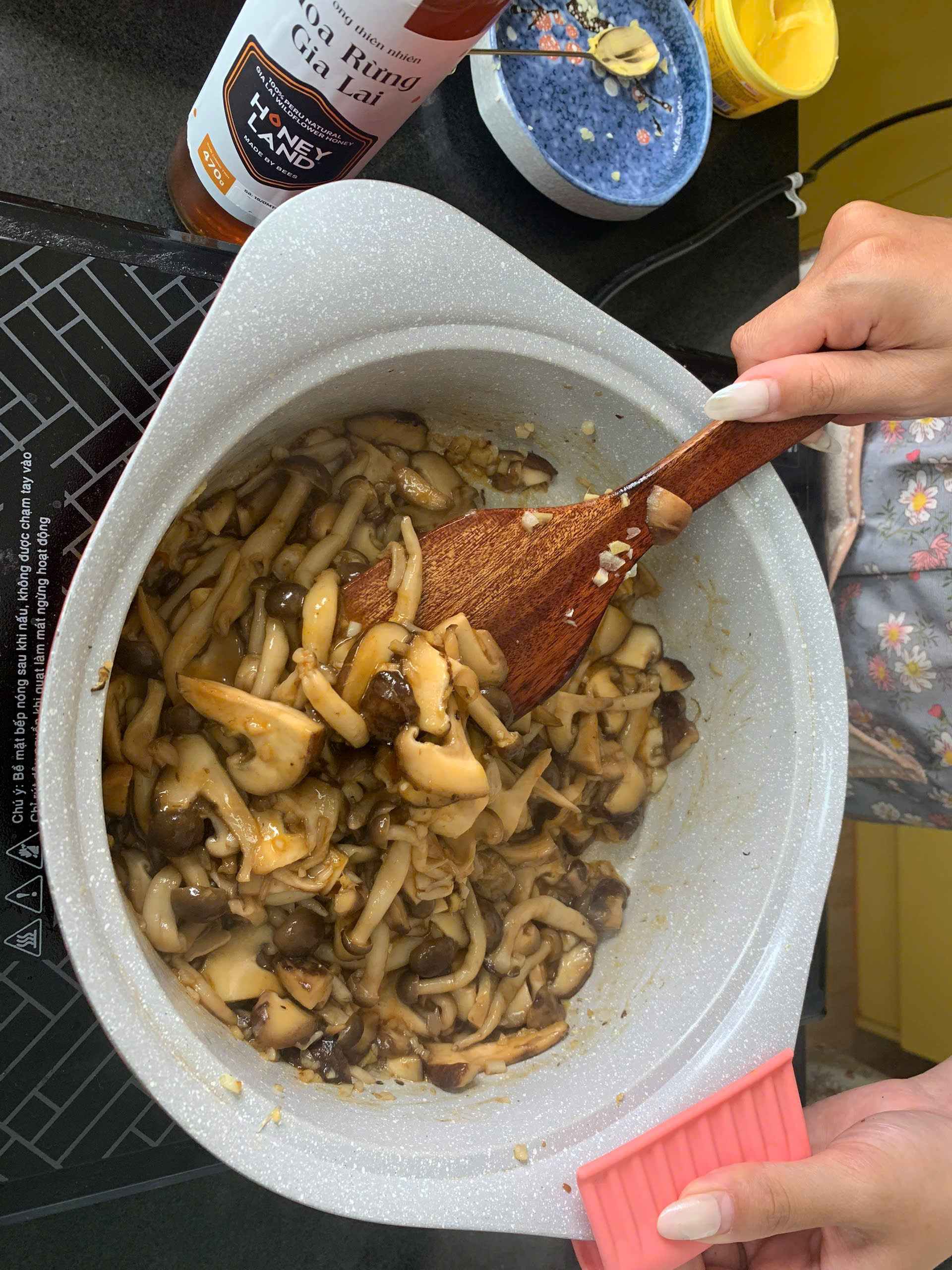 Trong một bát nhỏ, trộn đều mật ong hoa rừng Gia Lai, nước tương và tiêu xay. Khi nấm đã săn và bắt đầu hơi xém cạnh, rưới phần sốt mật ong vào chảo. Đảo nhẹ tay để sốt bám đều vào nấm, đun thêm 2-3 phút đến khi sốt sánh lại.