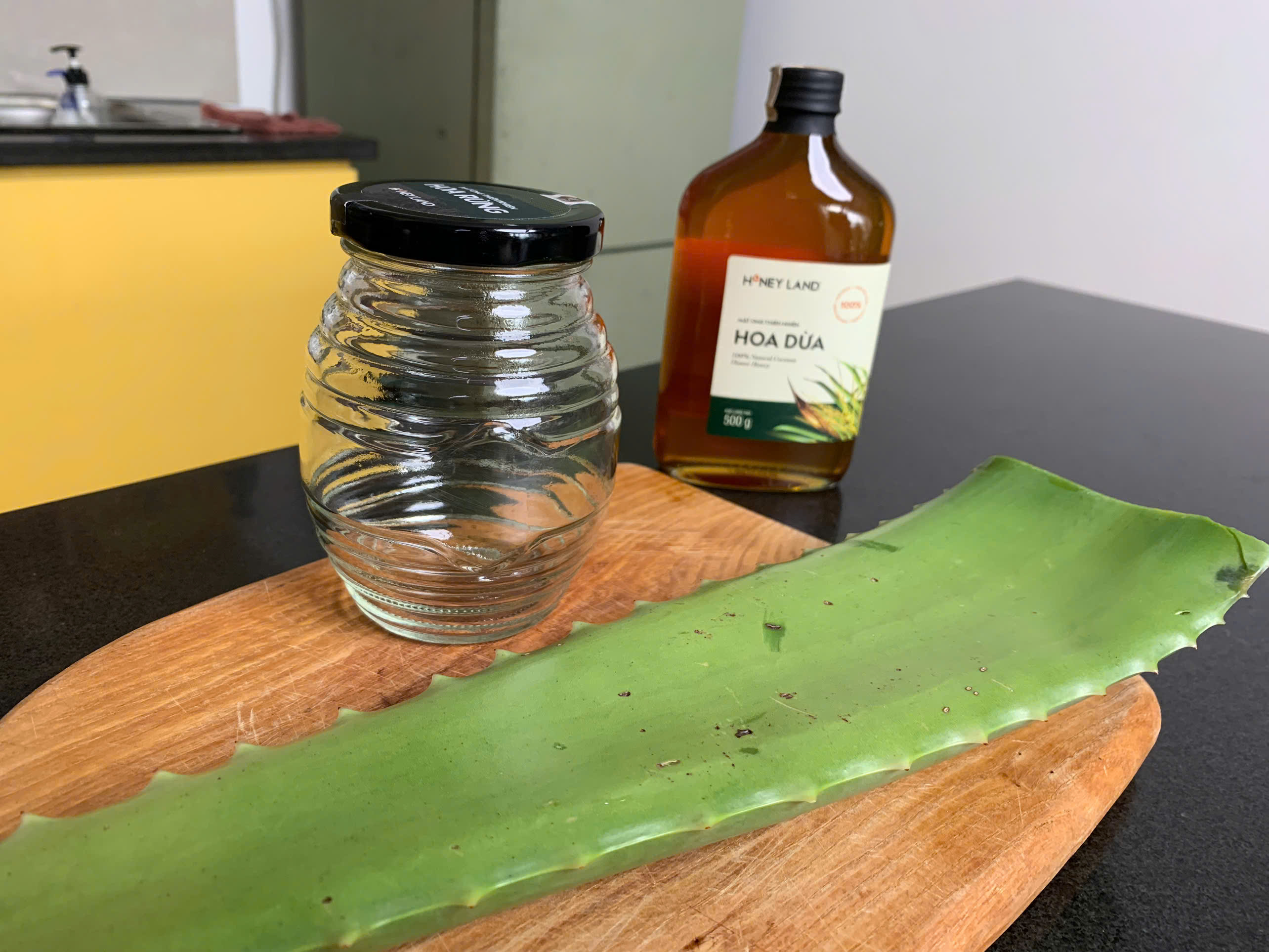 Để nha đam ráo nước hoàn toàn, sau đó cho vào hũ thủy tinh sạch. Rót mật ong ngập mặt nha đam. Dùng thìa sạch hoặc đũa gỗ khuấy nhẹ cho nha đam ngấm đều mật ong.