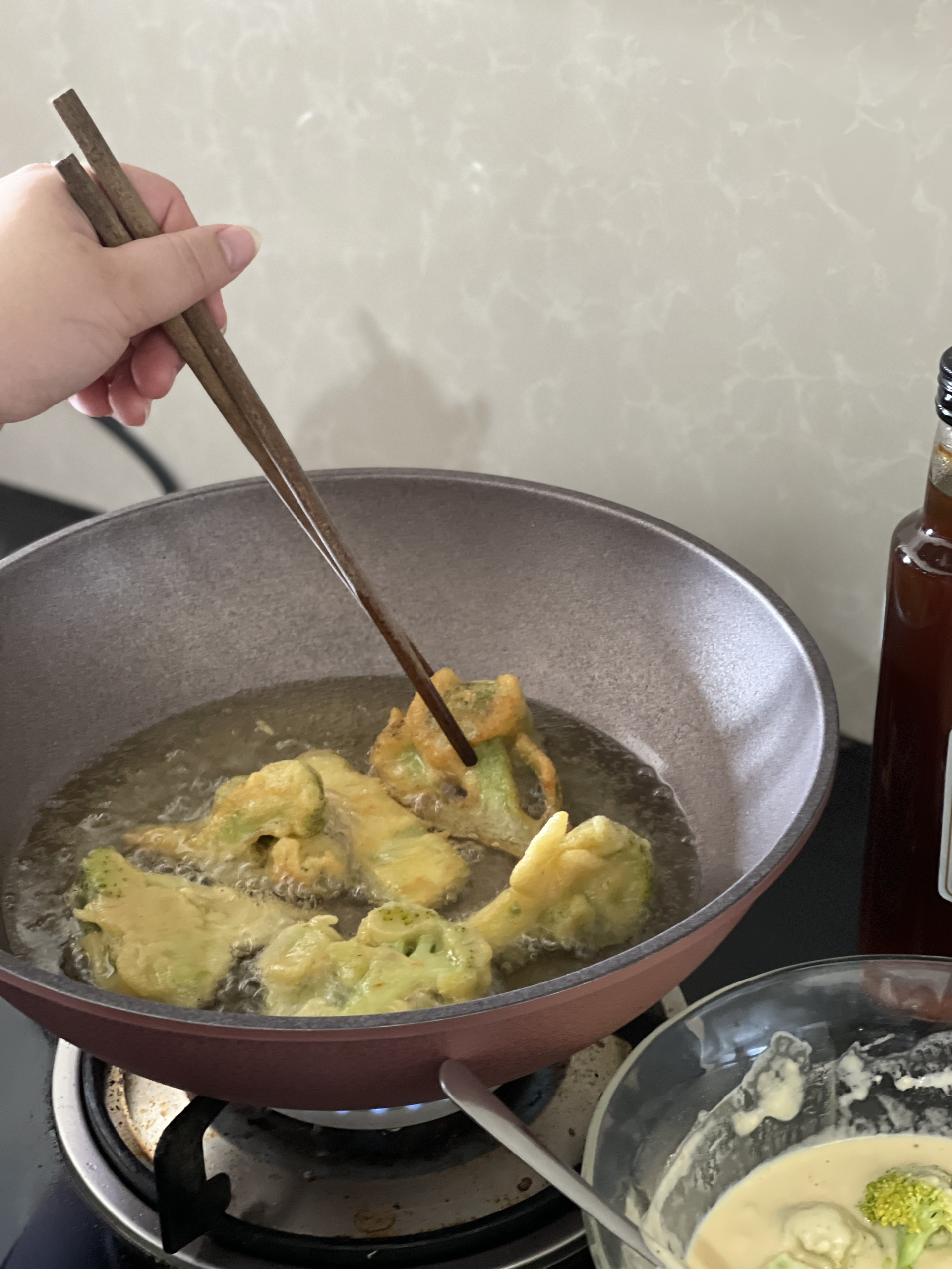 Cho ngập dầu vào chảo, để dầu thật nóng, bạn chú ý canh để dầu ngập ngang miếng súp lơ, và để lửa vừa phải, để bên trong miếng súp lơ chín mà bên ngoài không bị cháy nhé.