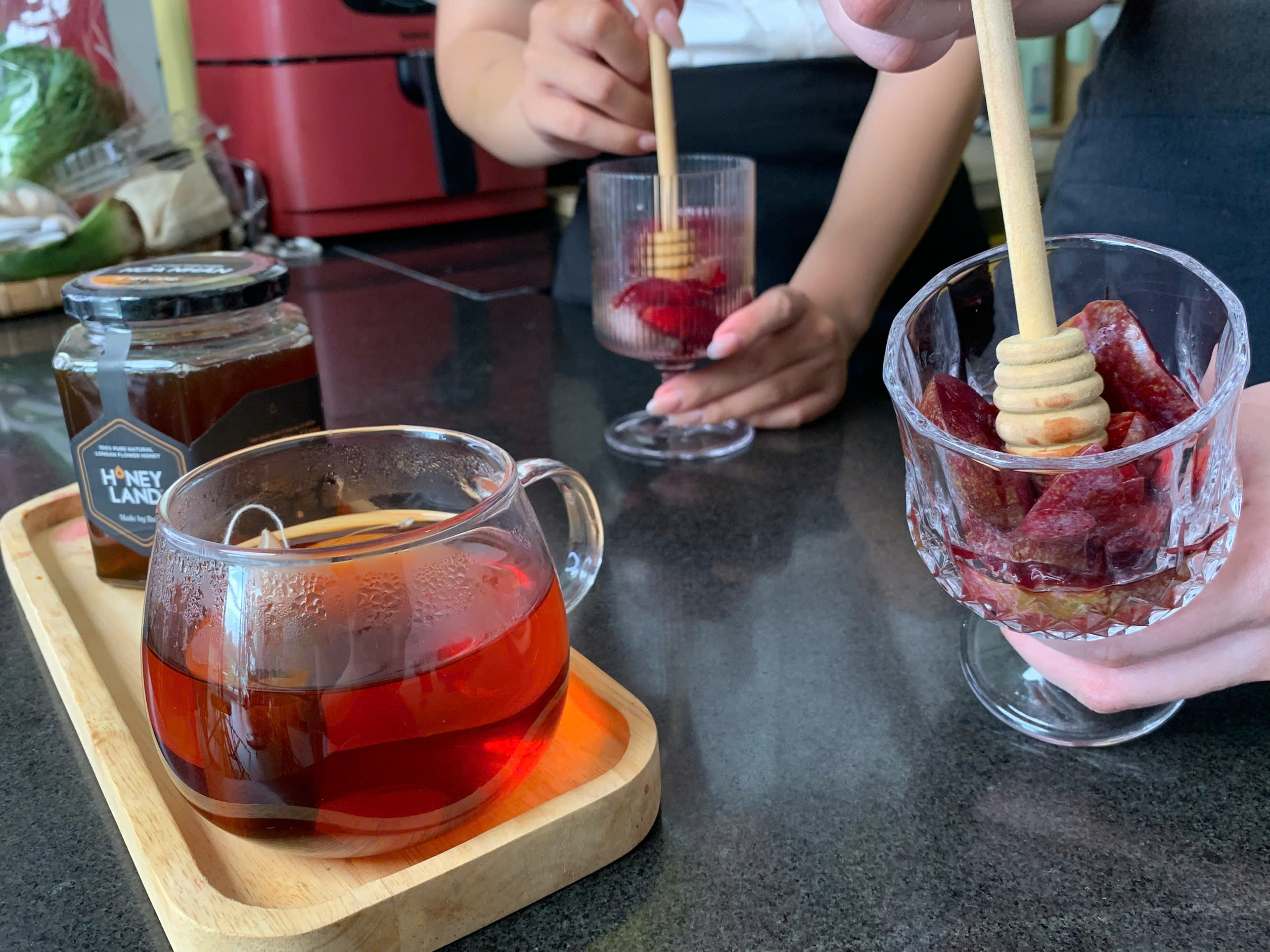 Trà mận mật ong là sự kết hợp thú vị giữa vị chua nhẹ của mận tươi, vị thanh mát của trà và độ ngọt dịu, thơm nhẹ từ mật ong hoa nhãn – loại mật ong tự nhiên, được khai thác từ những vườn nhãn bạt ngàn của vùng đồng bằng Bắc Bộ. Không chỉ giúp giải nhiệt, trà mận dằm còn là một thức uống đẹp da, tốt cho tiêu hóa và cực kỳ dễ làm. Cùng HONEYLAND khám phá cách làm món trà mận dằm mật ong đơn giản, không cần bếp ngay dưới đây!
