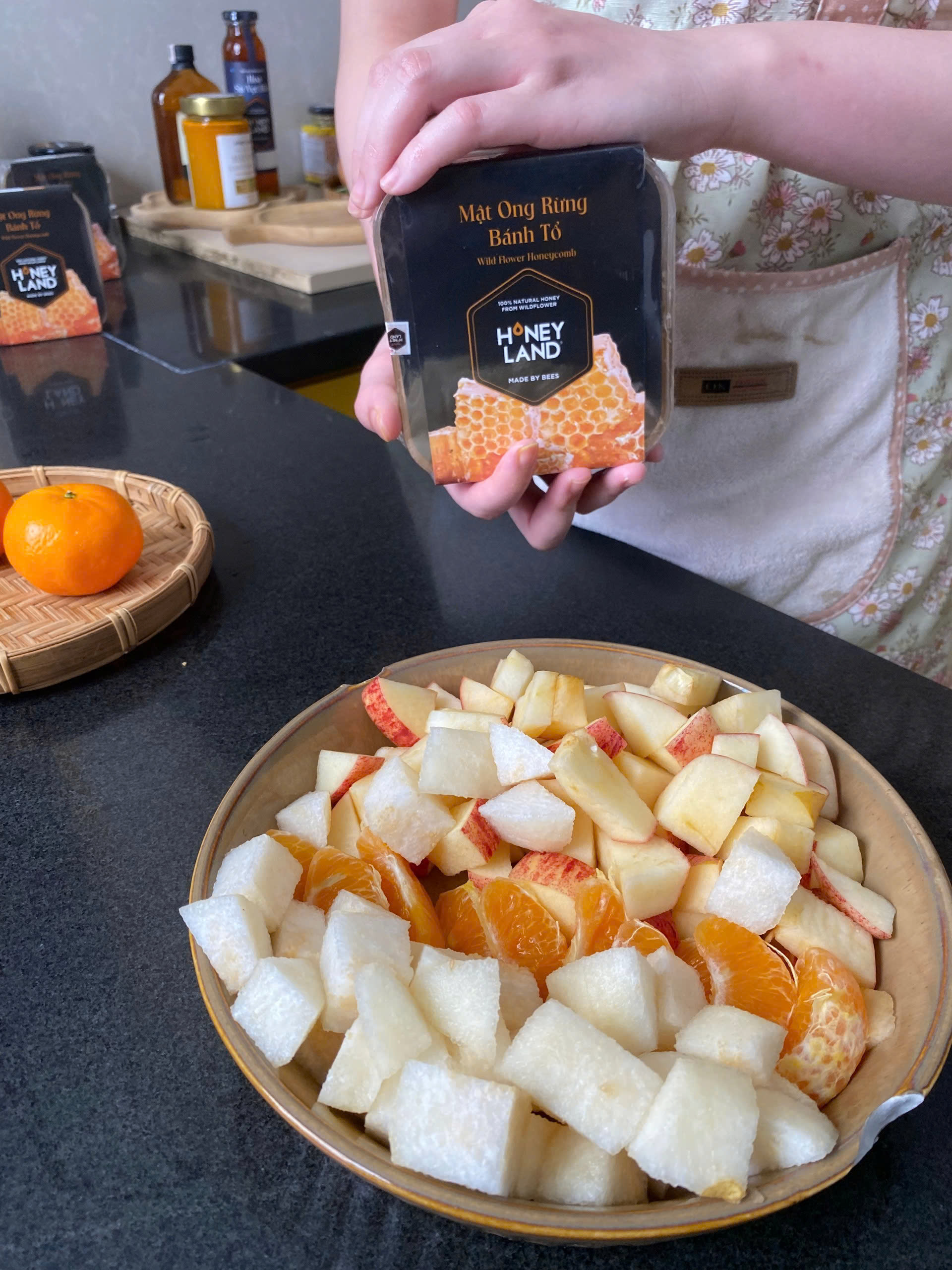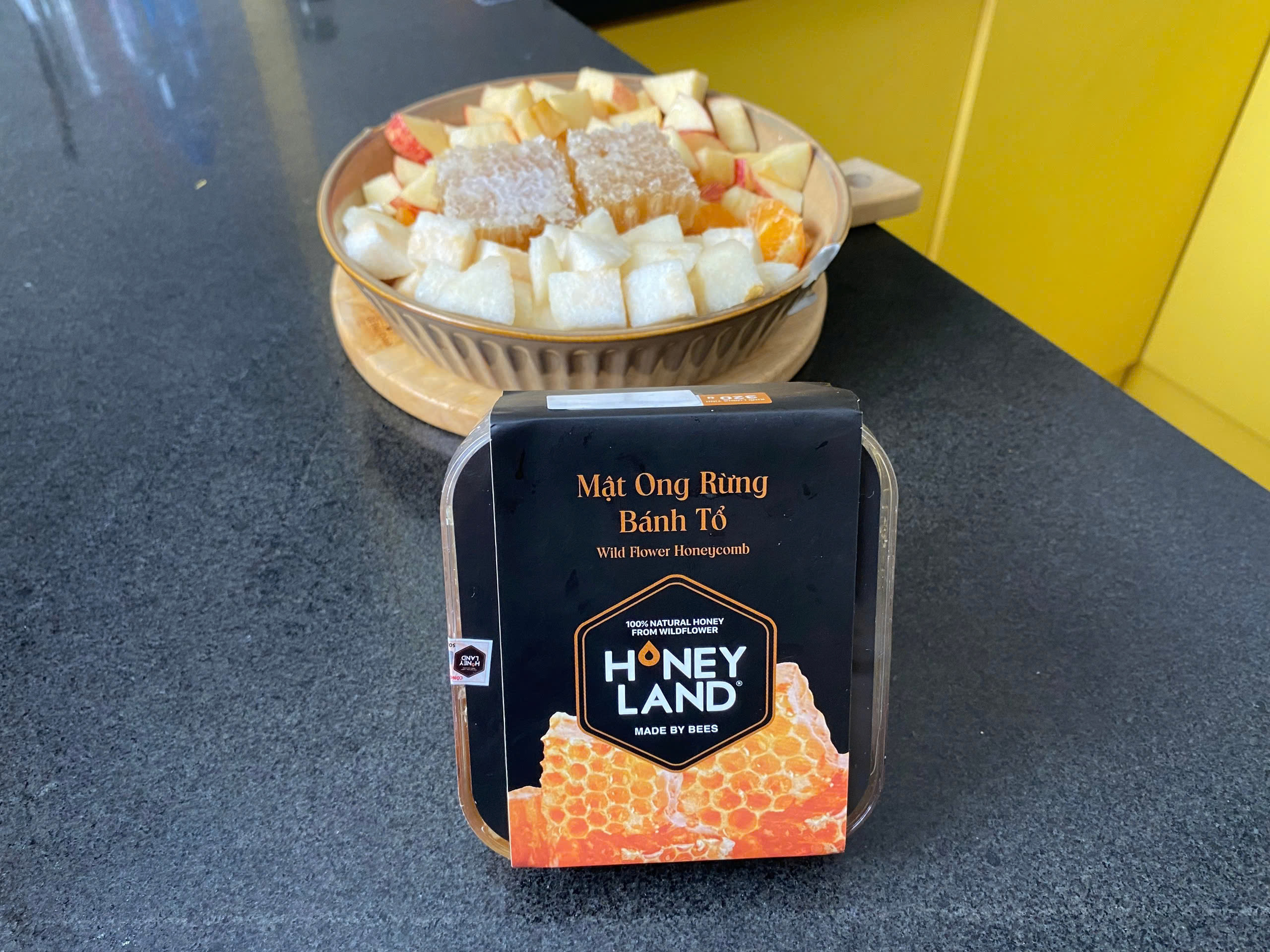 Khi mật ong bánh tổ Honeyland được rưới lên trái cây, hương thơm của mật ong sẽ thấm vào từng miếng trái cây, tạo nên một hương vị ngọt ngào, dễ chịu, không quá gắt mà lại rất tự nhiên.