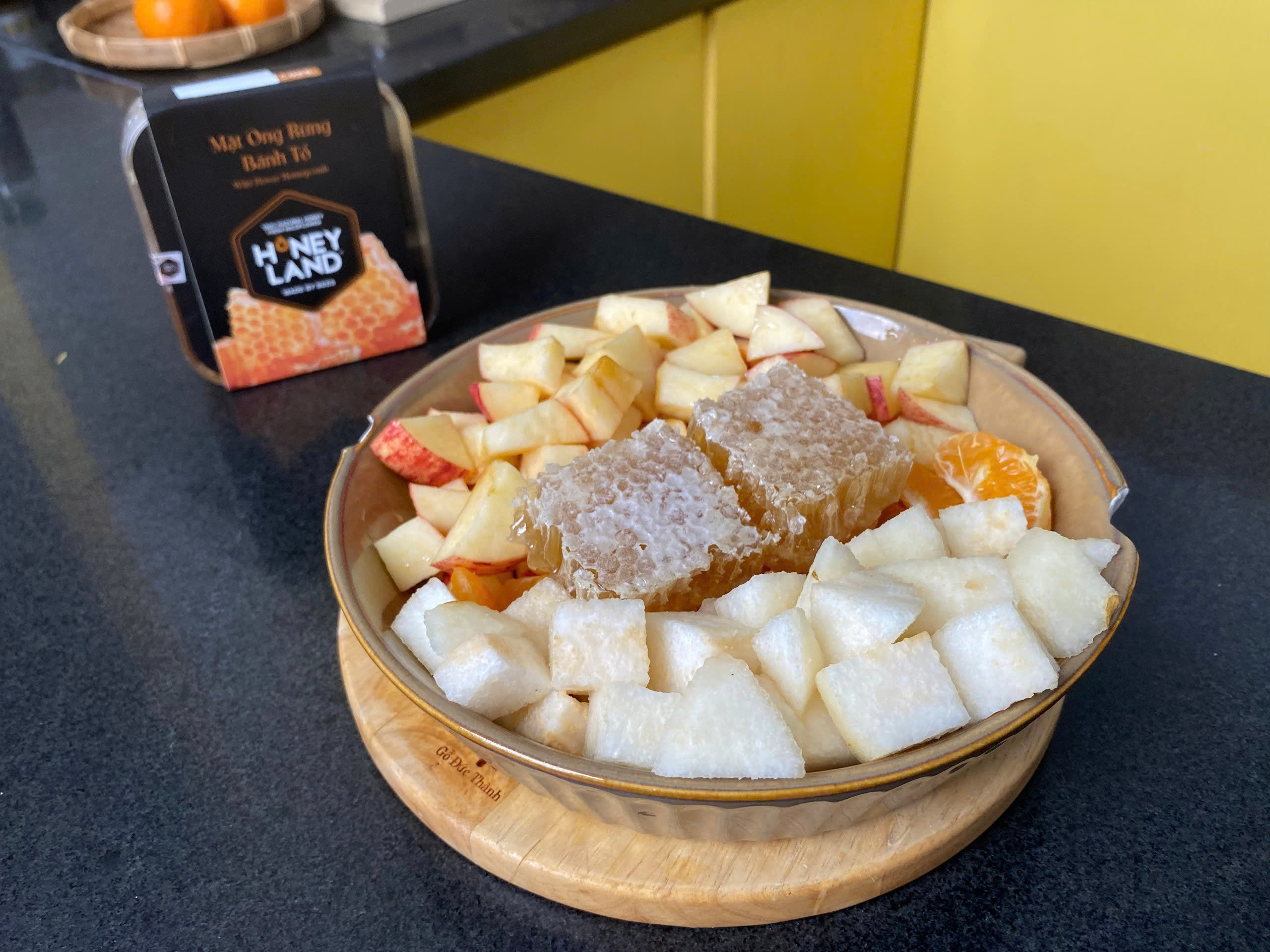 Trái cây thố ăn kèm bánh tổ mật ong là món ăn đơn giản nhưng vô cùng hấp dẫn, đặc biệt là khi kết hợp với mật ong tự nhiên từ nhà Honeyland. Được lấy trực tiếp từ cầu ong tươi, mật ong bánh tổ giữ nguyên vẹn giá trị dinh dưỡng và hương vị thiên nhiên, mang đến một trải nghiệm ẩm thực đầy mới lạ. Khi thưởng thức món ăn này, bạn sẽ cảm nhận được sự kết hợp hoàn hảo giữa vị ngọt thanh mát của trái cây tươi và hương vị đặc biệt từ mật ong bánh tổ – tươi ngon, nguyên chất và đậm đà hương vị thiên nhiên.