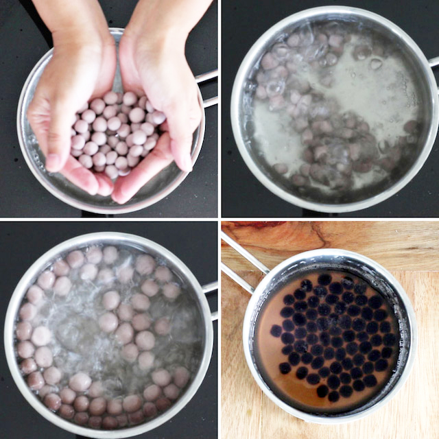 Nước đun sôi, thả trân châu vào luộc...