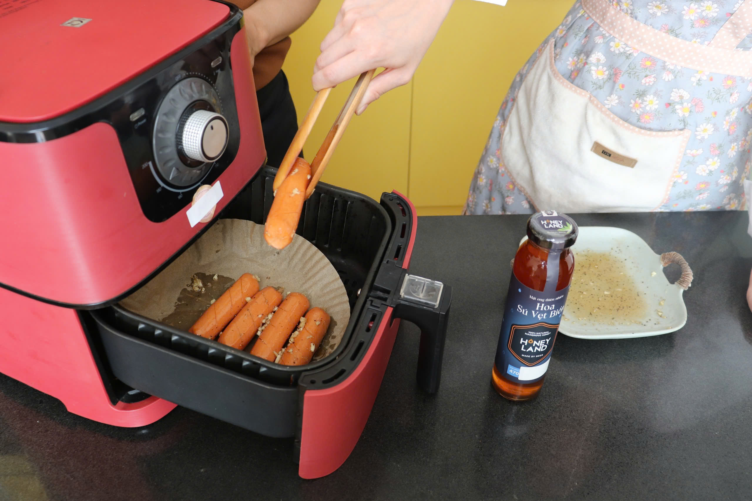 Trong khi nướng, bạn có thể dùng một cây cọ quét thêm mật ong lên xúc xích để tạo lớp bóng và hương thơm hấp dẫn. Khi xúc xích nướng chín đều và có màu vàng nâu đẹp mắt, bạn có thể cho ra đĩa.