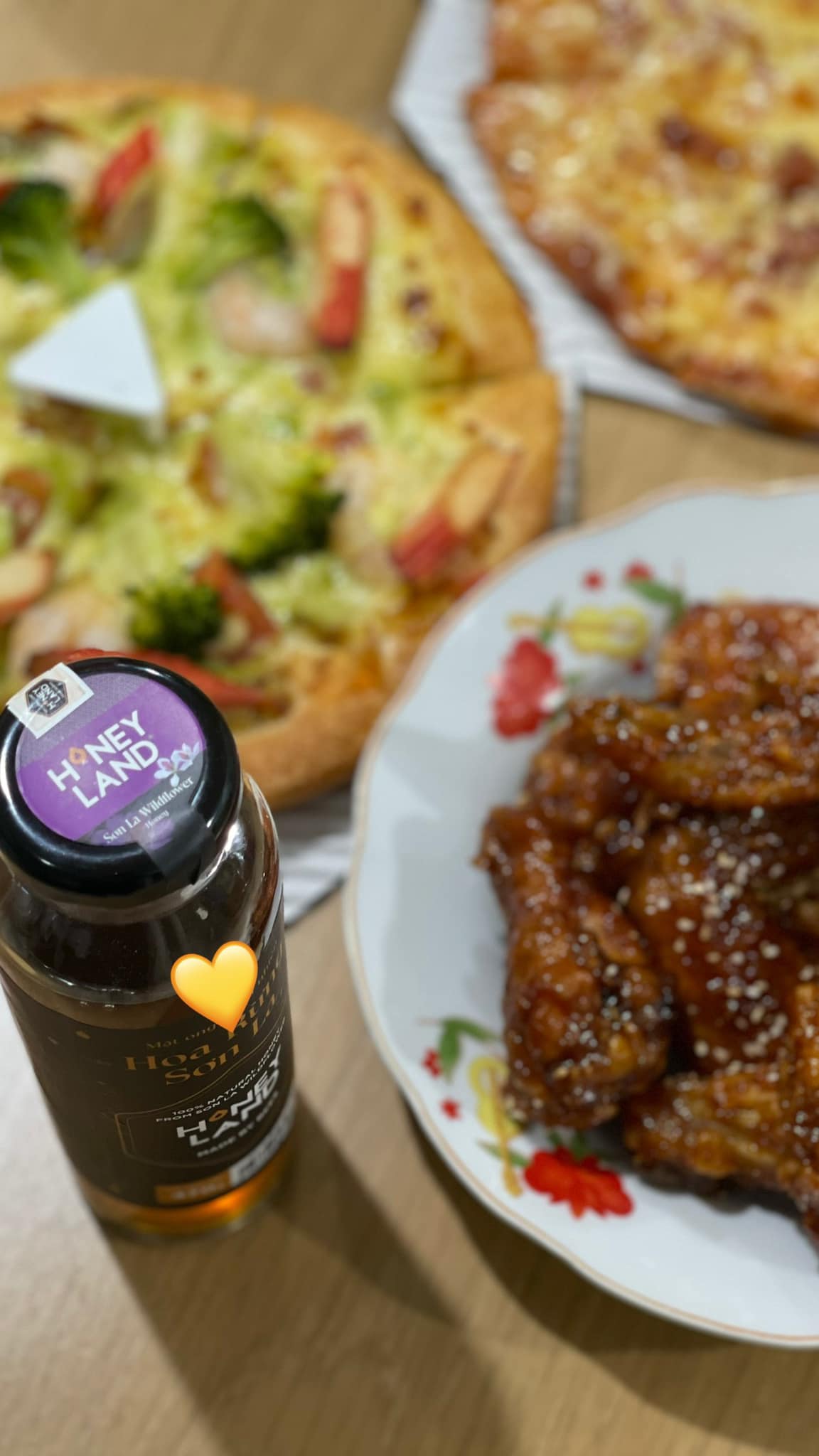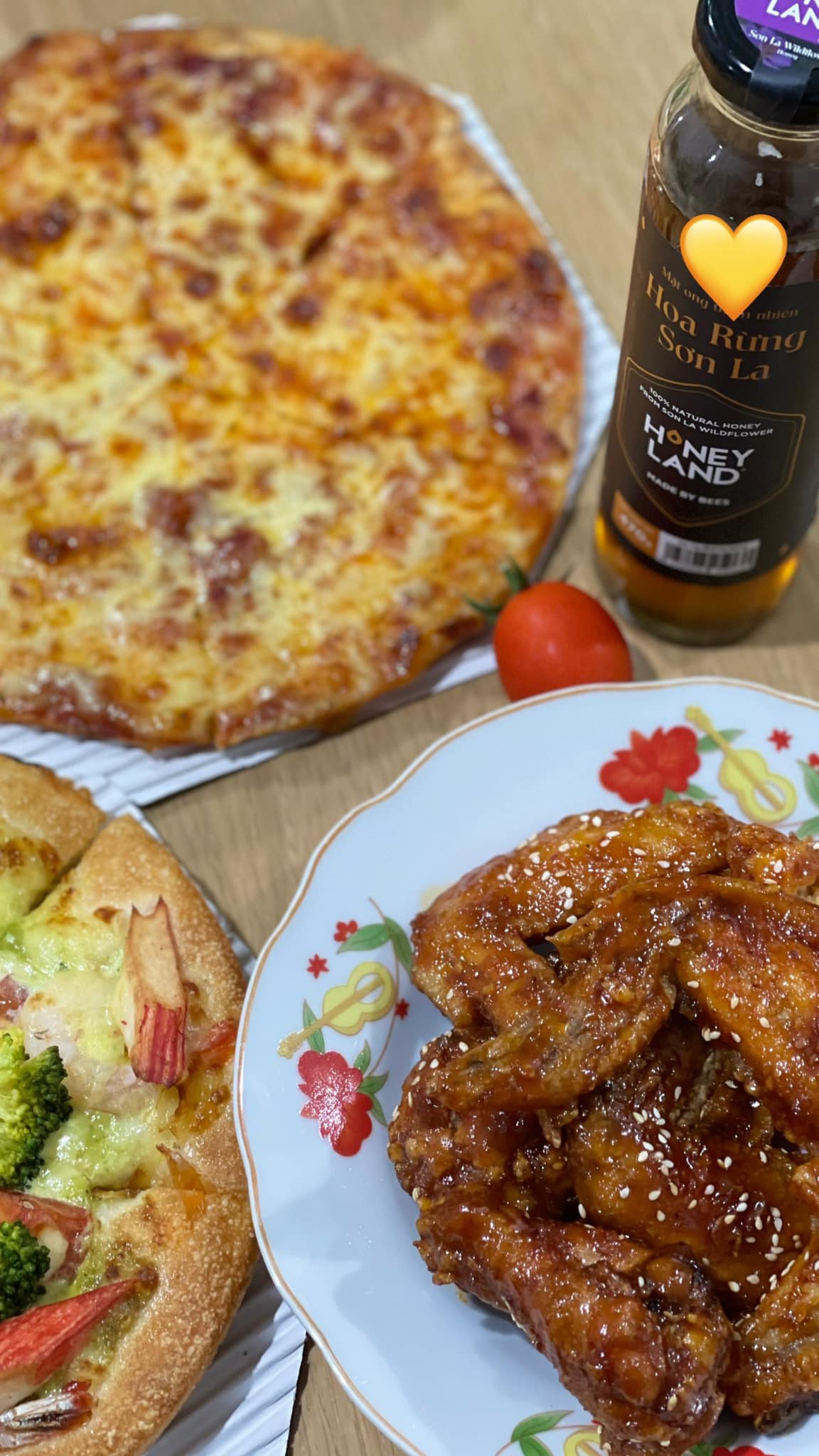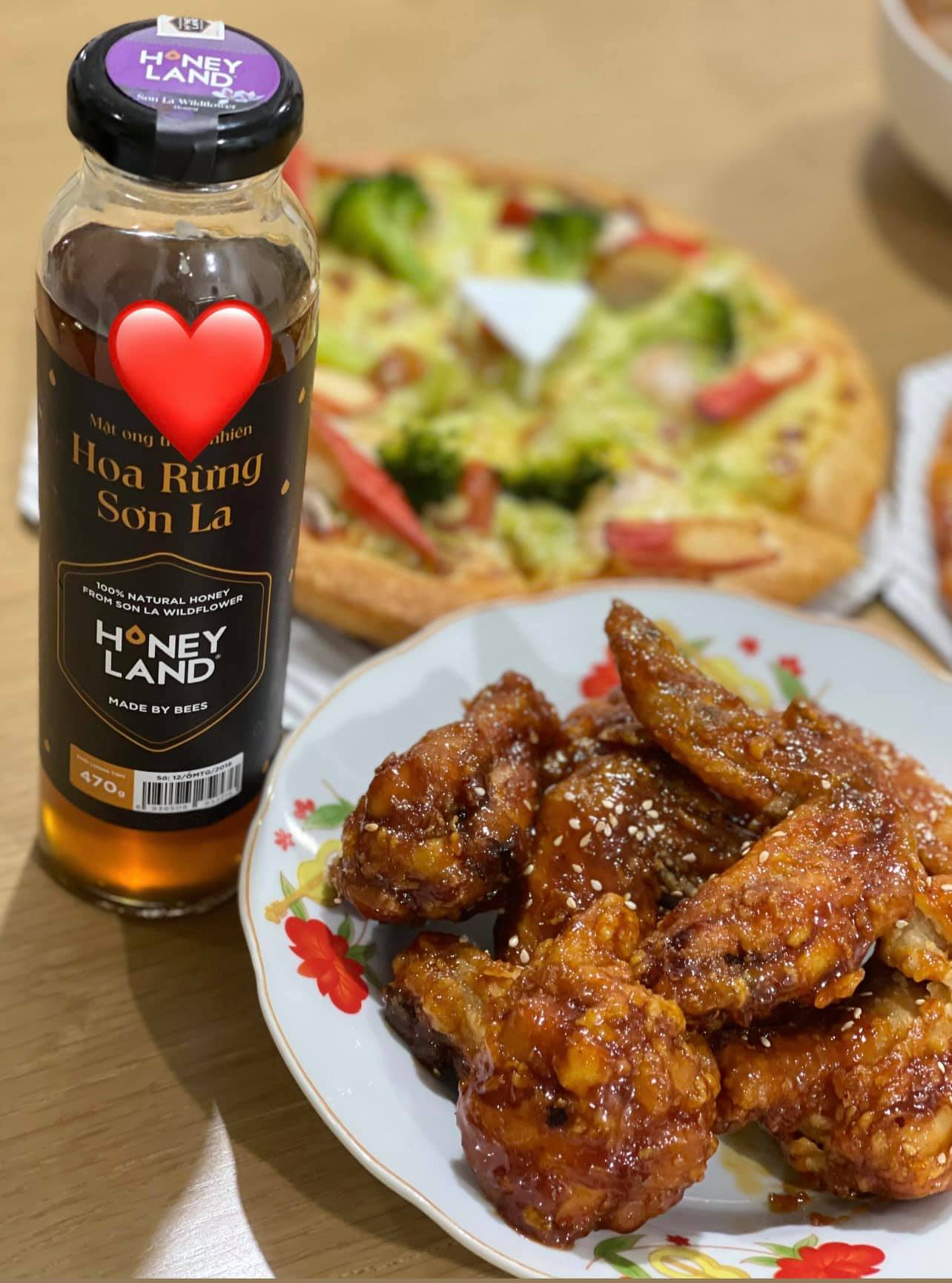 Bên cạnh đó, bạn còn có thể ăn kèm Gà nướng Mật ong hoa rừng Sơn La HoneyLand cùng với những miếng bánh Pizza giòn rụm, béo bùi, sẽ giúp món ăn trở nên lôi cuốn hơn. Tất cả sẽ tạo nên một tổng thể hấp dẫn, gắn kết yêu thương đầu Xuân năm mới.