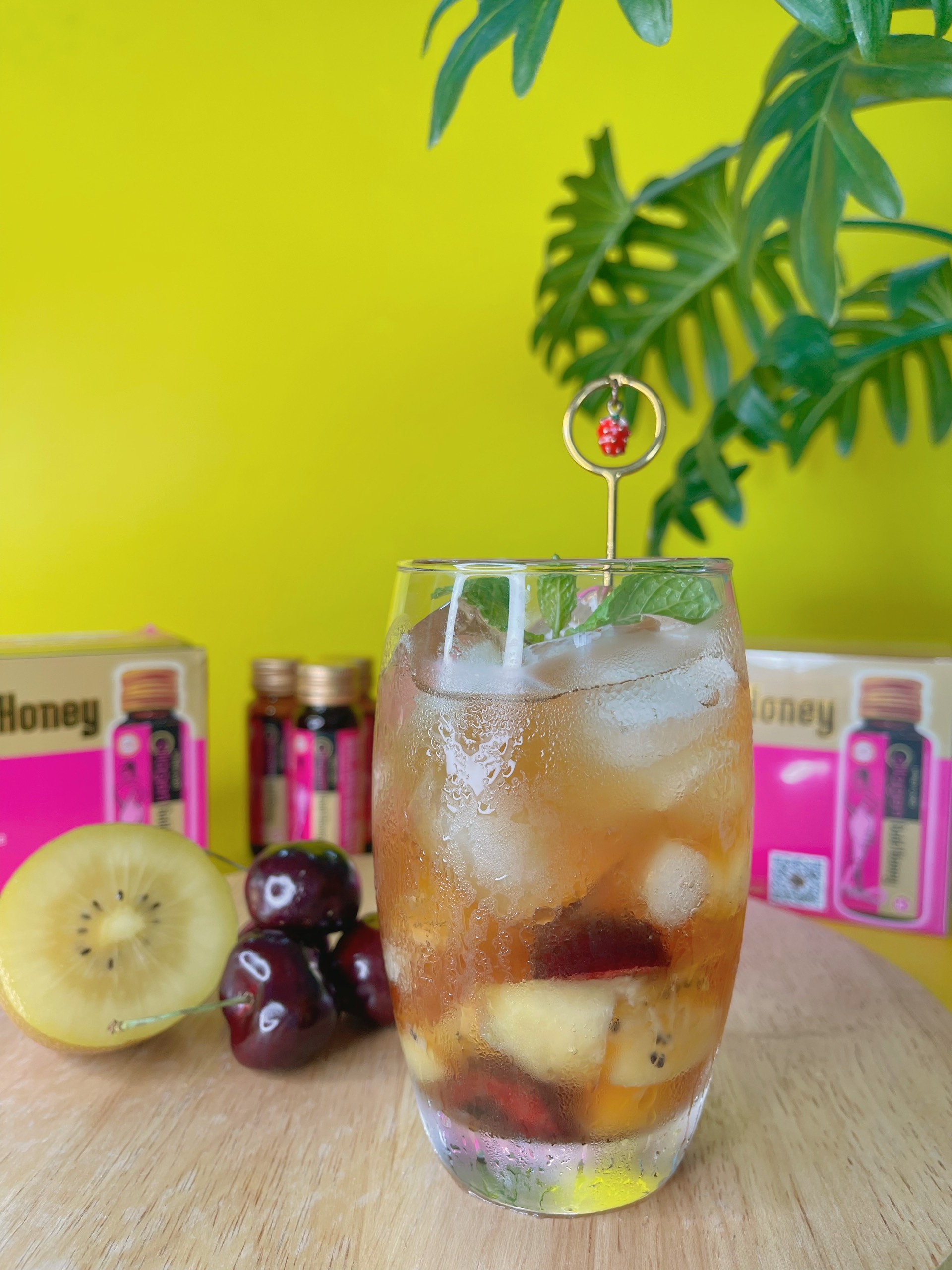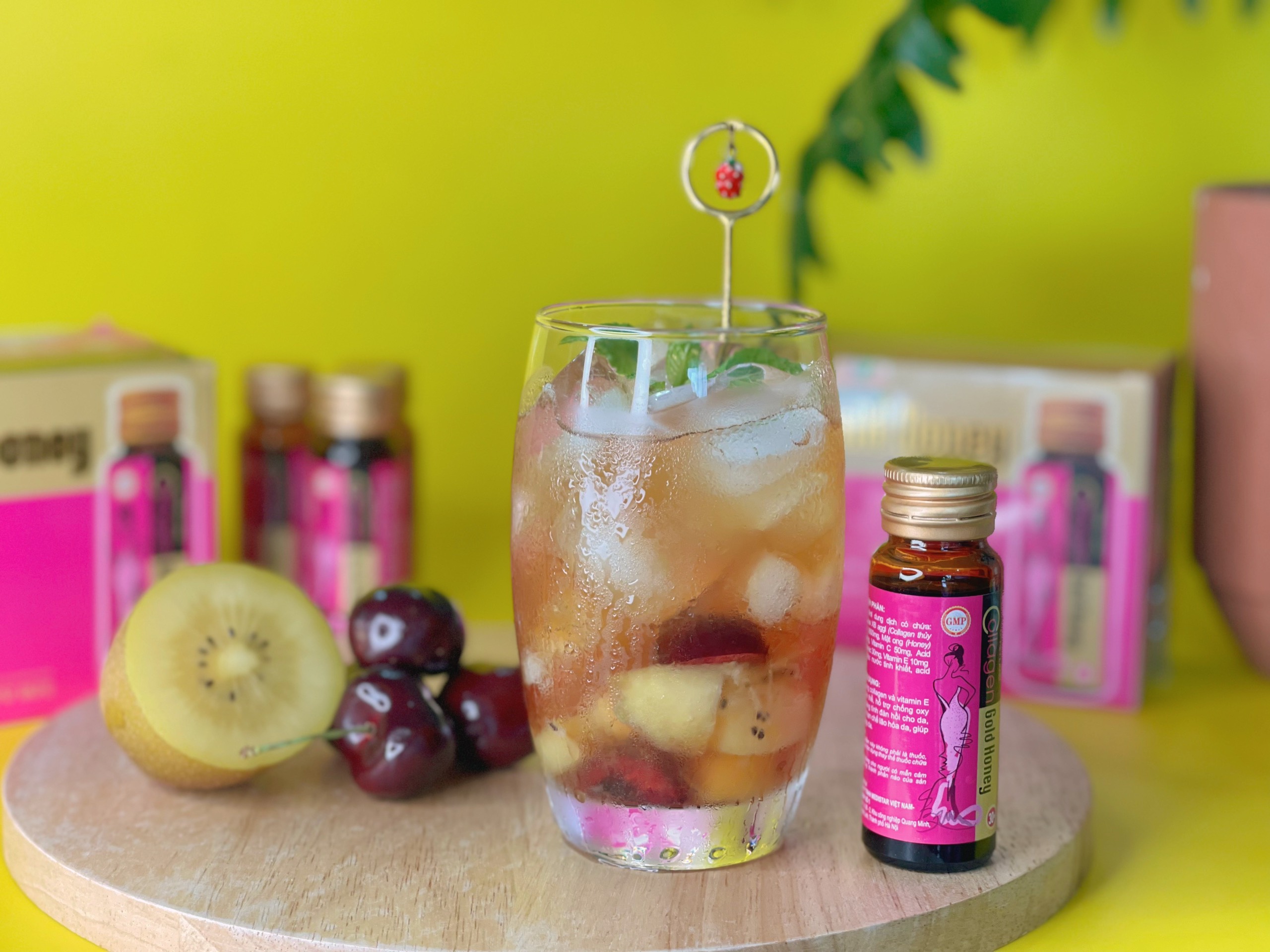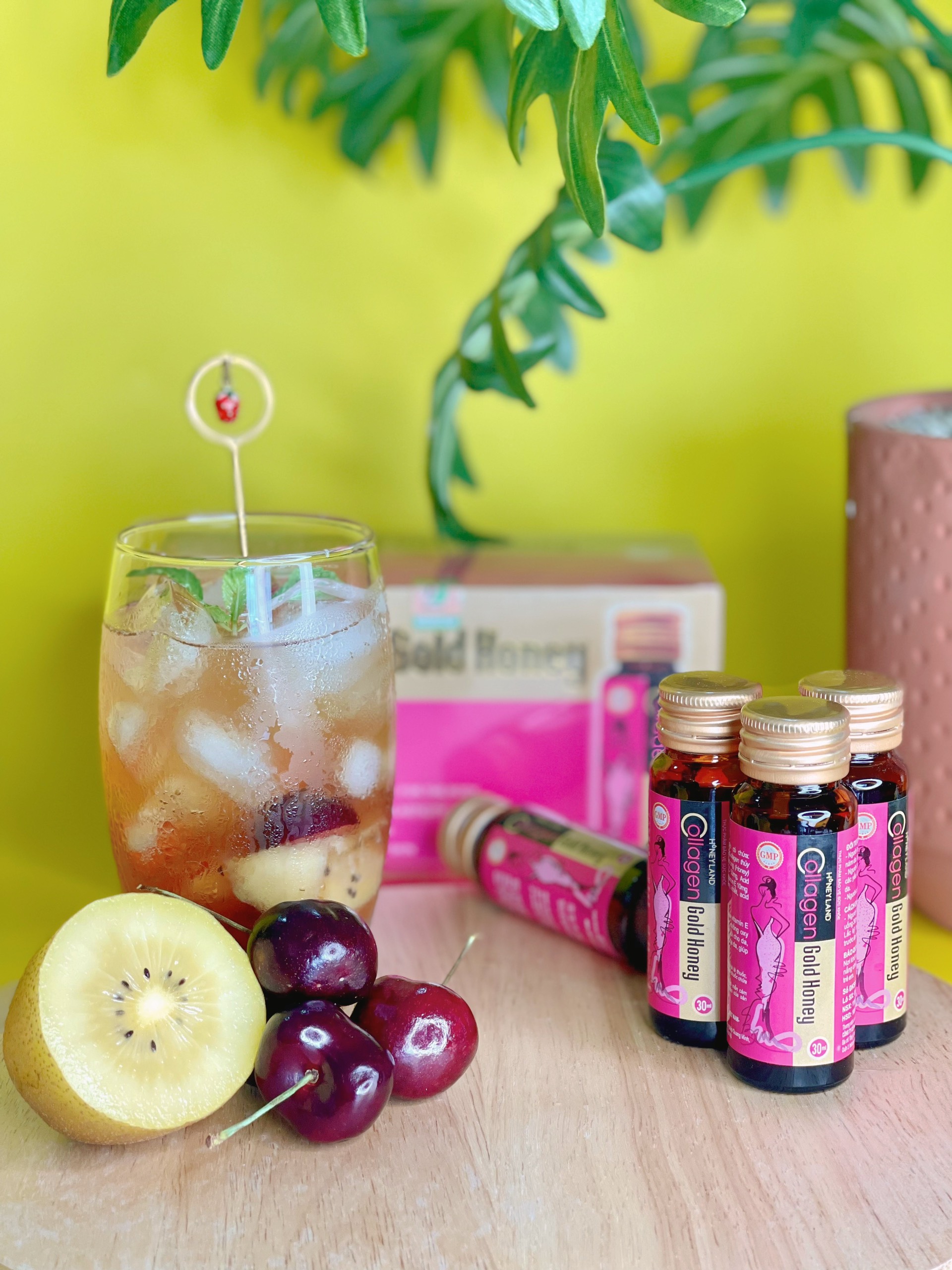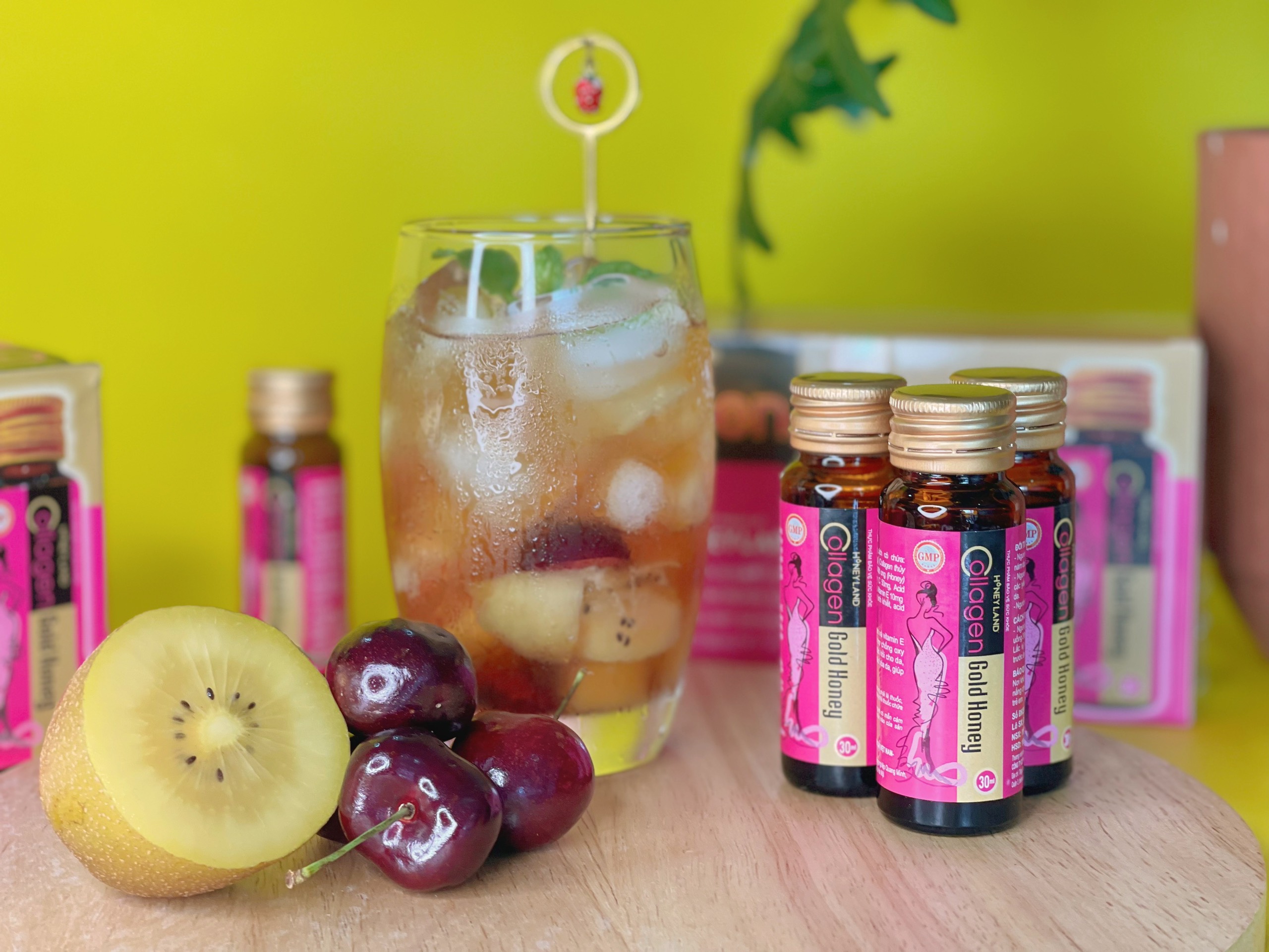 Honeyland chia sẻ đến bạn thêm một cách thức pha chế tại nhà Thức Uống Collagen Gold Honey Kết Hợp Cherry Và Kiwi