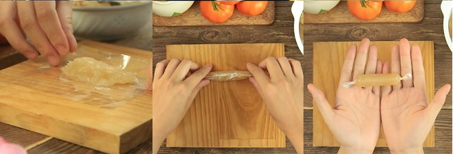 Sau khi phơi khô thì sẽ đến công đoạn gói kẹo. Bạn cho một lượng mãng cầu vừa ăn vào giữa miếng kiếng, sau đó quấn lại và xoắn 2 đầu cho giống hình viên kẹo là được.