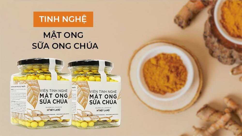 Với thành phần chứa 60% tinh nghệ Curcumin vàng, 20% mật ong HoneyLand và 20% sữa ong chúa tươi nguyên chất. Viên tinh nghệ Mật ong Sữa ong chúa HoneyLand hỗ trợ điều trị bệnh viêm loét dạ dày, đại tràng, tá tràng và các bệnh về đường ruột rất hiệu quả. Bên cạnh đó, đối với trẻ em lười ăn, còi xương hay suy dinh dưỡng, sản phẩm hỗ trợ trị chứng biếng ăn rất tốt. Mỗi ngày, trẻ từ 13 tuổi trở lên nên uống 2 lần, mỗi lần từ 3 đến 4 viên để có tác dụng tốt nhất.
