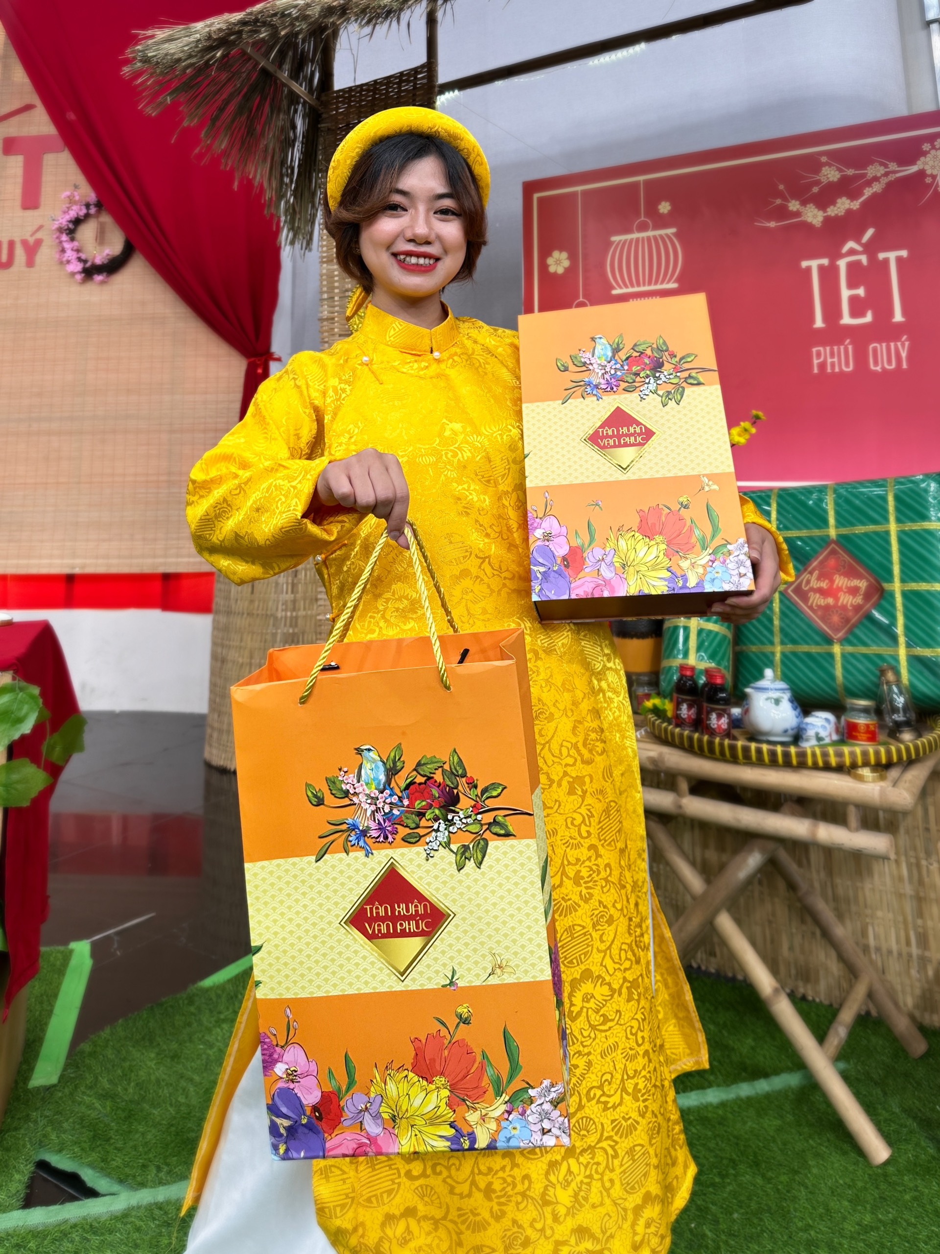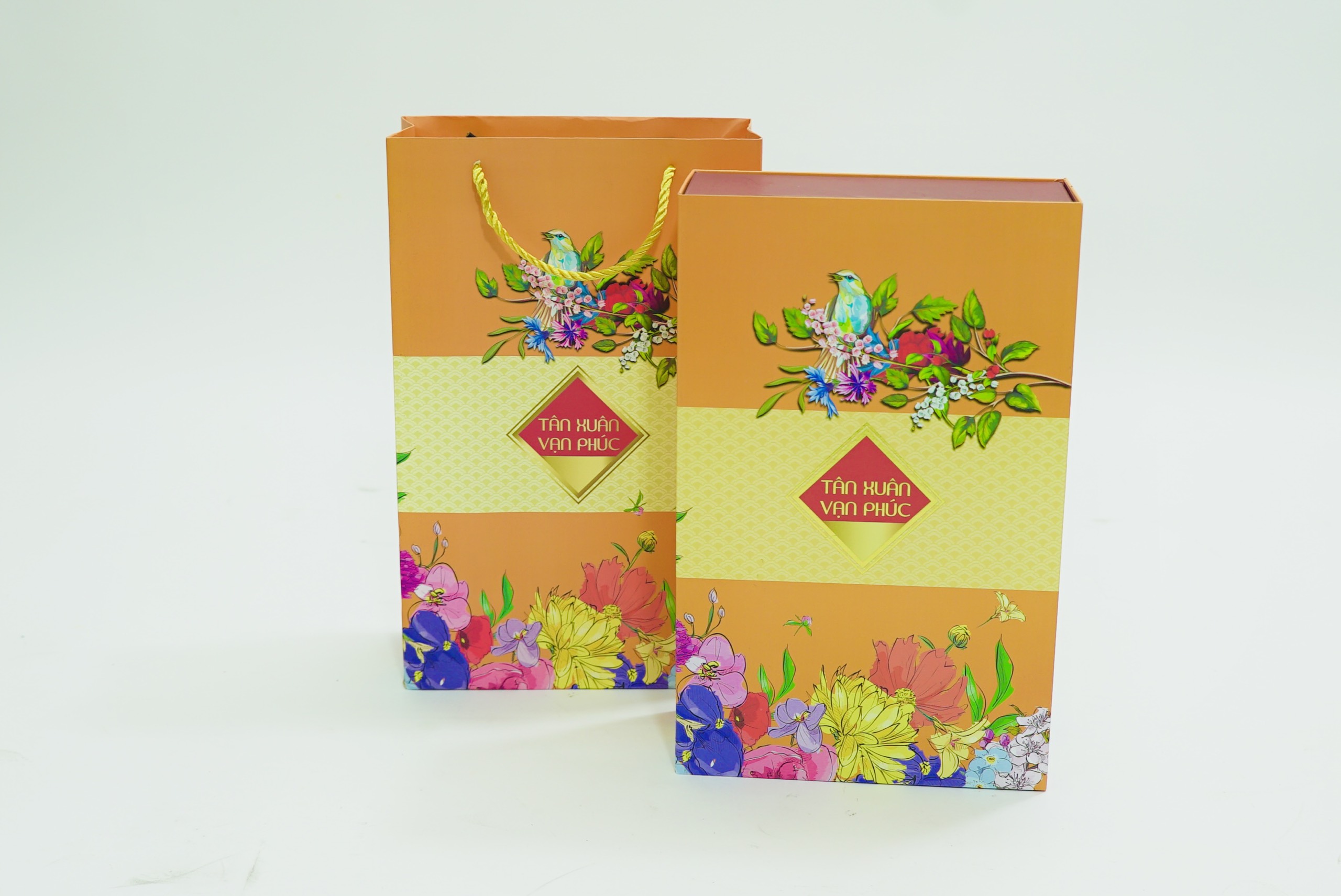 Hộp quà Tết 2023 có đi kèm một túi xách giấy, hỗ trợ bạn trong việc bảo quản và vận chuyển hộp quà.