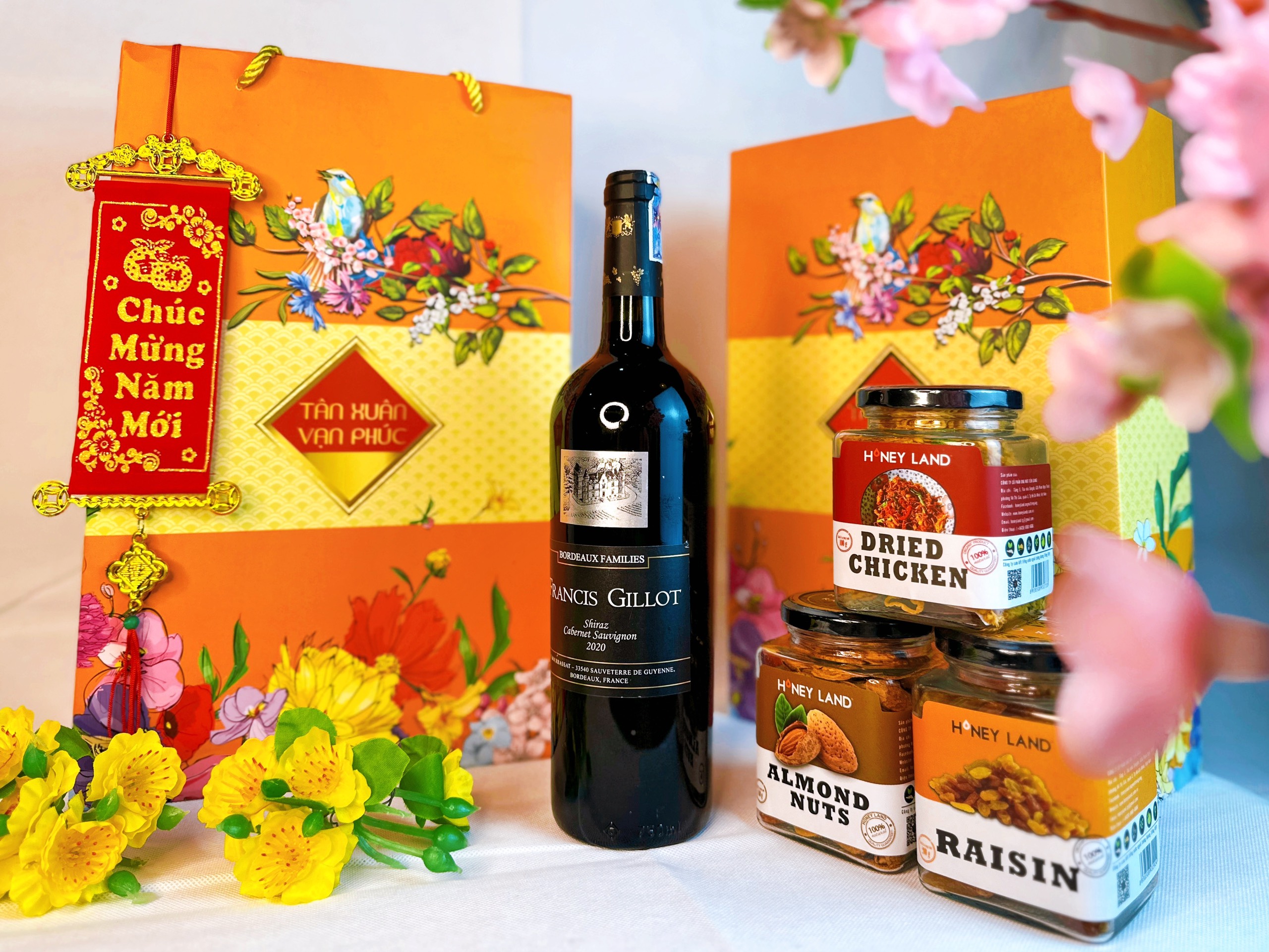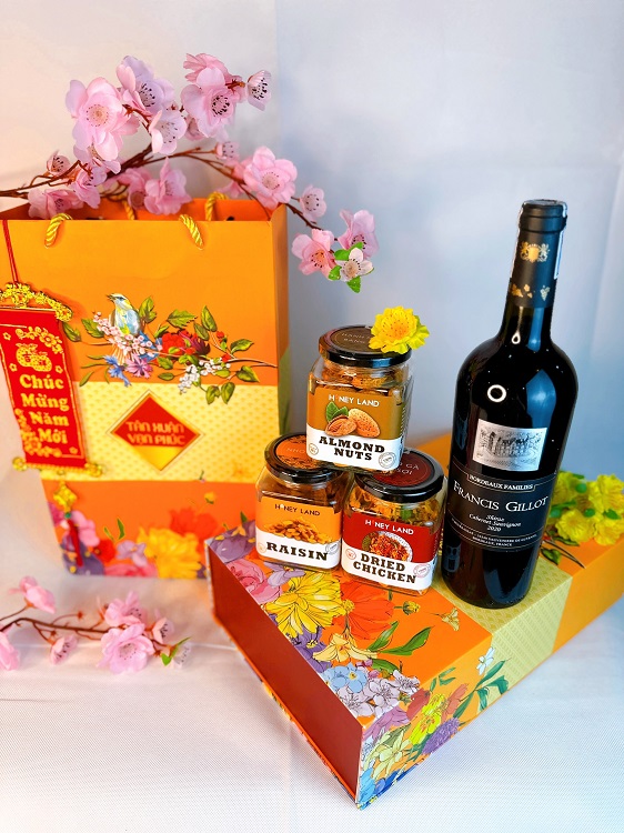 Hộp quà Tết có Rượu vang, Nho Vàng sấy khô, Hạt hạnh nhân rang bơ cùng Khô gà lá chanh, hộp quà phù hợp với cả người ăn chay hay ăn mặn.