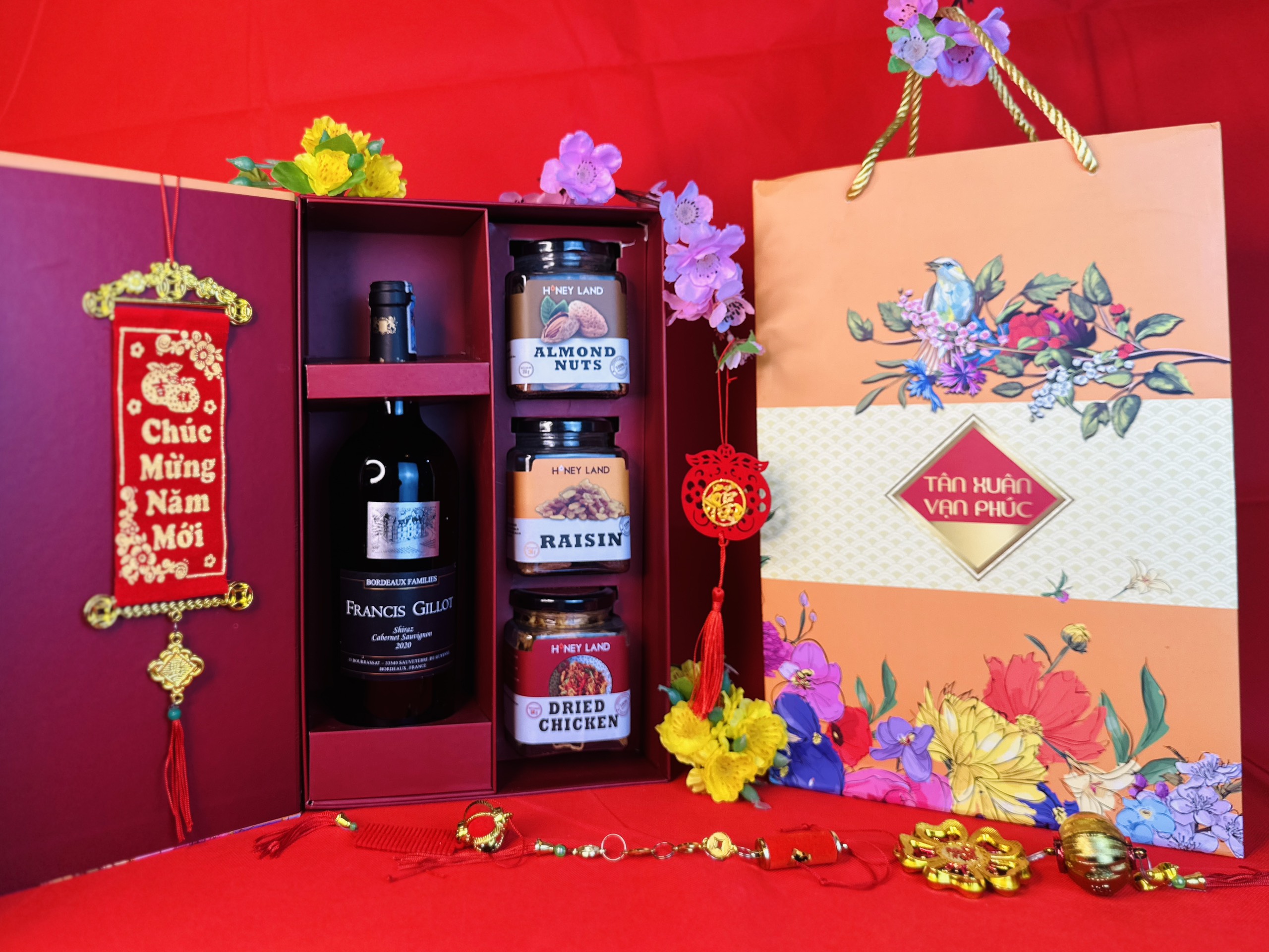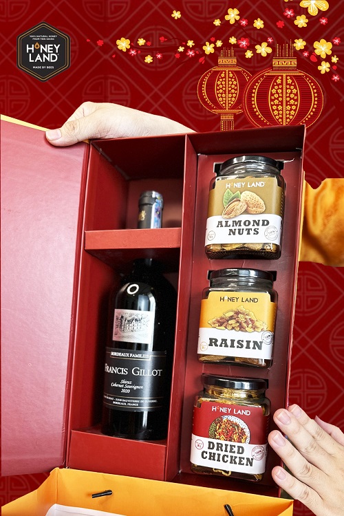 Trong mỗi Hộp quà Tết 2023 "Tân Xuân Vạn Phúc"của HoneyLand sẽ có một chai Rượu vang, hoa quả sấy khô, các loại hạt ngũ cốc, cùng Khô gà lá chanh để nhâm nhi ăn vặt. Tùy theo nhu cầu tặng quà của bạn, mà HoneyLand sẽ có những sự kết hợp linh động về những sản phẩm đi kèm. Và dù lựa chọn thế nào, thì về tổng thể trong mỗi hộp quà Tết của HoneyLand đều có 1 chai rượu vang cao cấp, đi kèm là 3 hũ đồ ăn thực dưỡng.