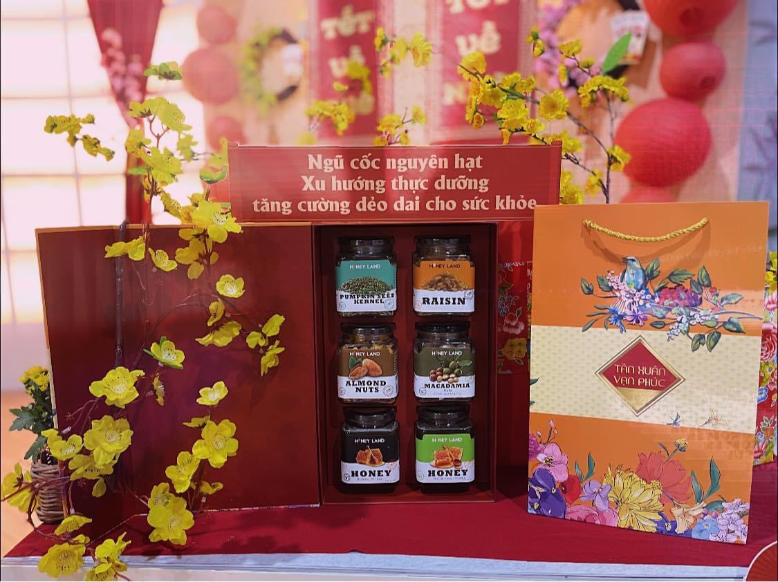 Còn nếu bạn muốn tập trung hoàn toàn vào 1 bộ quà toàn các món thực dưỡng thì bạn có thể lựa chọn hộp quà Tết 2023 "Tân Xuân Vạn Phúc" với 6 món thực dưỡng. Bên trong là những món ăn thực dưỡng kết hợp với những hũ mật ong của HoneyLand, nắm bắt xu hướng nâng cao sức khỏe, tăng cường sức đề kháng mà người dùng hiện nay đang hướng tới. Mỗi hộp quà đều là những sự bài trí sản phẩm khác nhau, tạo sự phong phú, đa dạng giúp bạn có nhiều lựa chọn hơn.