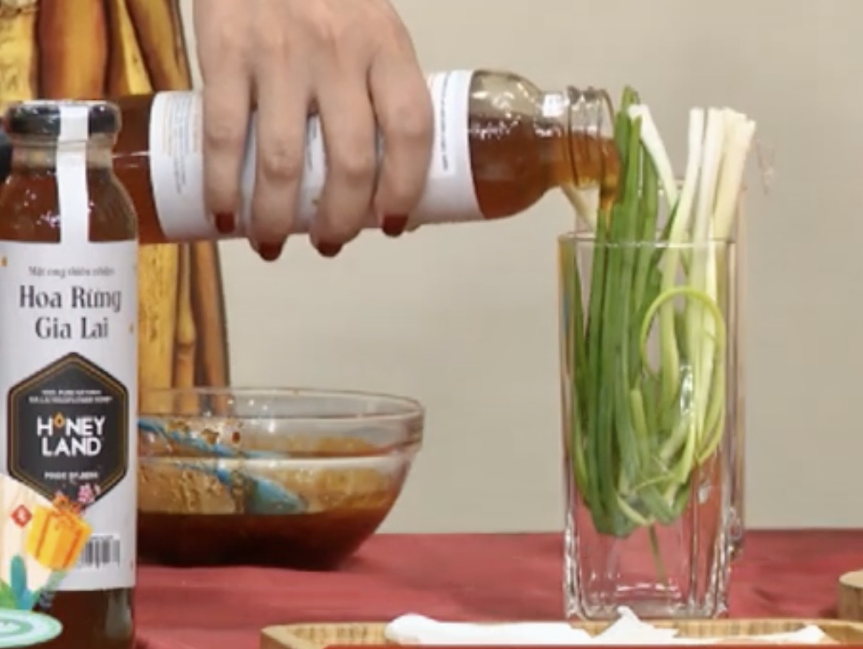Cách làm: lấy cọng hành tươi nhúng vào cốc mật ong