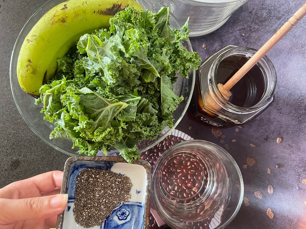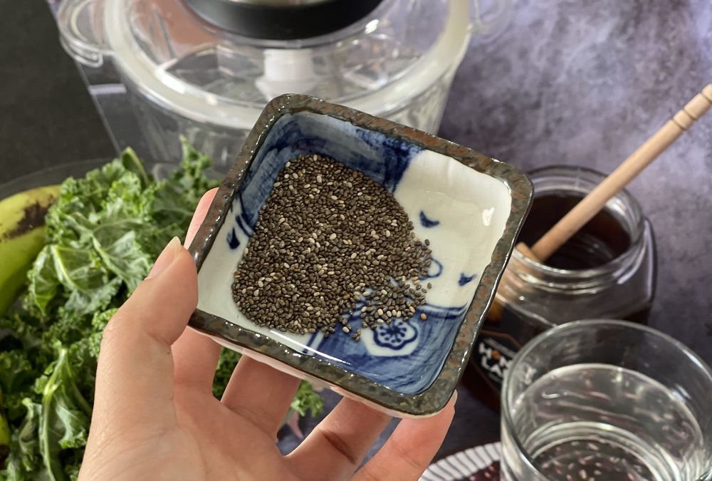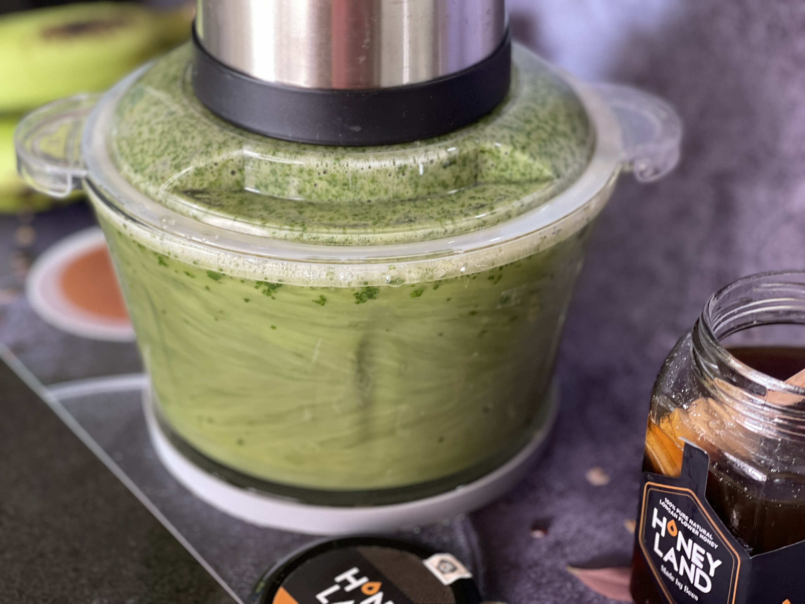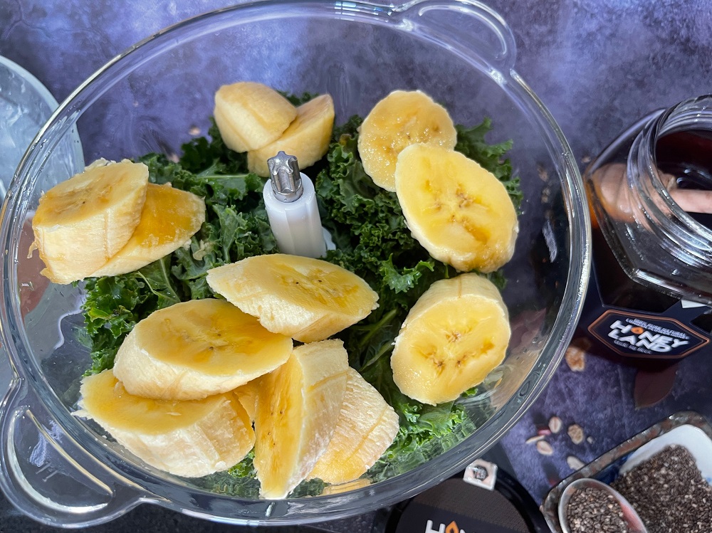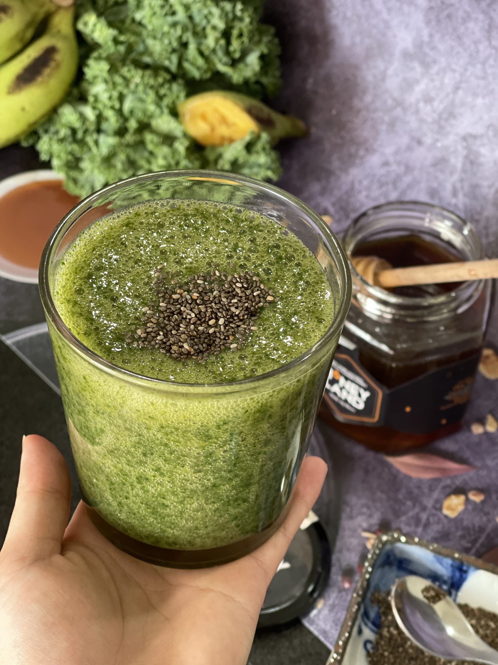 Honeyland chia sẻ đến bạn, cách làm sinh tố Cải xoăn Kale + Chuối + Hạt chia và Mật ong tại nhà nhé!