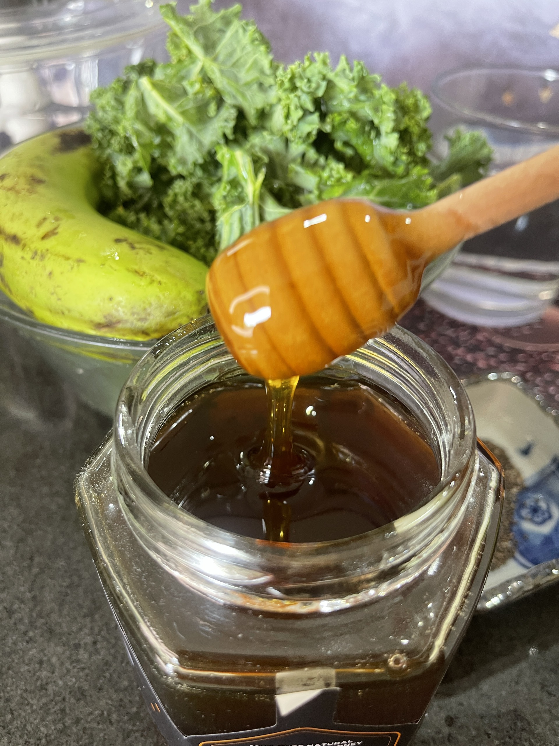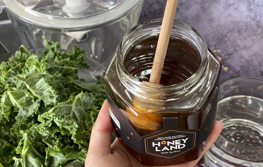 Honeyland khuyến khích sử dụng Mật ong Hoa Nhãn Honeyland để bổ sung thêm dinh dưỡng cho món sinh tố Cải Xoăn Kale Chuối