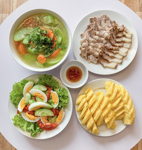 Nếu bạn chán những món chiên rán nhiều dầu mỡ thì mâm cơm với thịt luộc, salad, canh rau củ nêu trên là một lựa chọn không tồi và dễ dàng thực hiện, không cần mất quá nhiều thời gian.