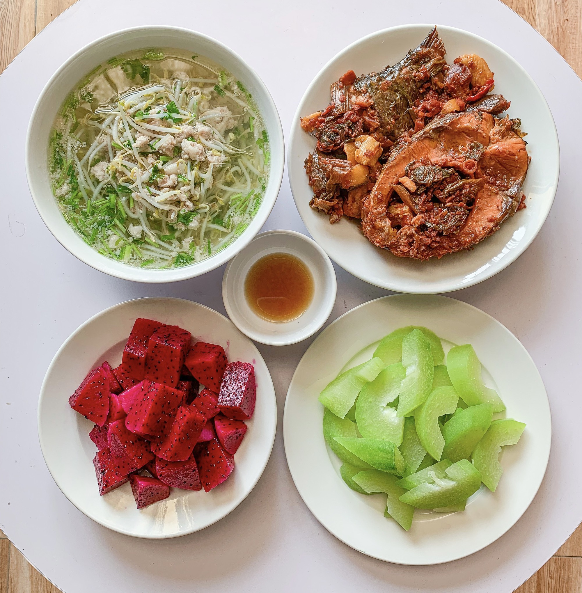 Mâm cơm gia đình với món cá kho phù hợp cho những người muốn đổi món cho các thành viên trong gia đình, ăn kèm bí luộc giúp cân bằng vị giác.