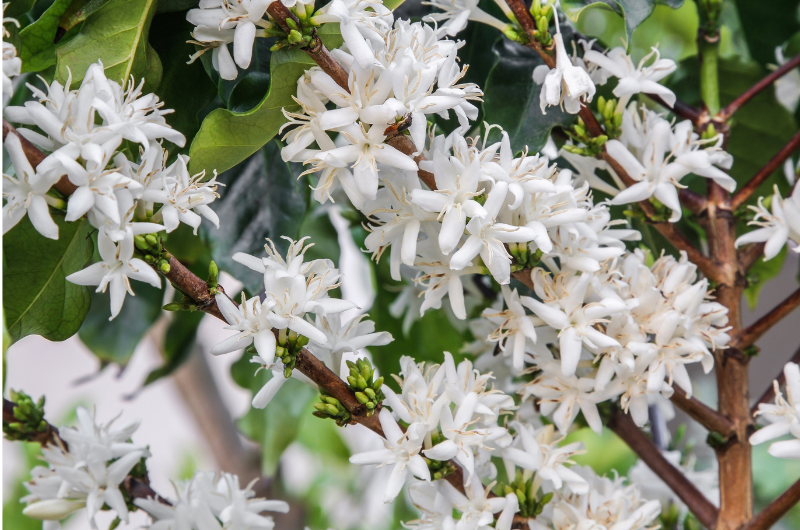 Hoa cà phê thường mọc thành chùm dọc cành. Cánh hoa mỏng, nở tròn xoe với nhị trắng đan xen, hao hao hoa cúc. Sau khi phô diễn vẻ đẹp rực rỡ của mình, hoa sẽ rụng cánh và dần kết thành từng chùm quả nhỏ xinh chen chúc bám trĩu cành.