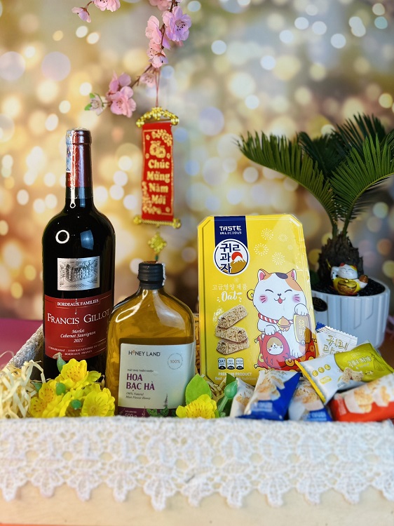 Nếu bạn thích trong hộp quà có rượu vang, thì bạn có thể lựa chọn Set quà Tết 3 món đơn giản này của HoneyLand