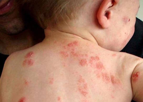 Các dấu hiệu đặc trưng của bệnh gồm da nổi mẩn đỏ, ngứa ngáy, có thể chảy dịch, phù nề,… Một số trẻ có thể ho, sốt, chán ăn và sụt cân.